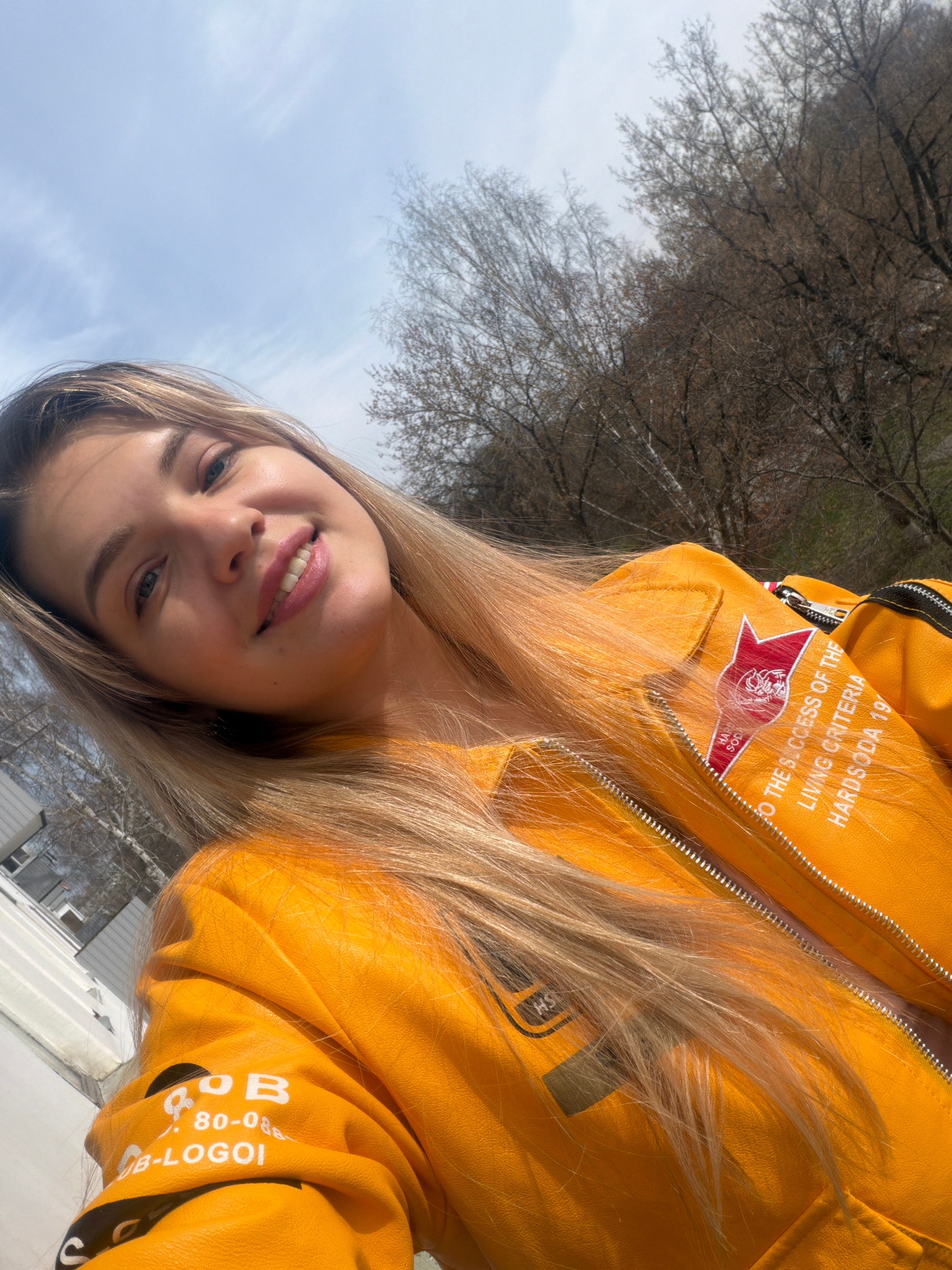 The image is a rotated selfie of a young woman with blonde hair wearing a yellow jacket. The jacket has text and a logo that includes the words "HARDSODA 19". The background consists of a blue sky, ba…read more
