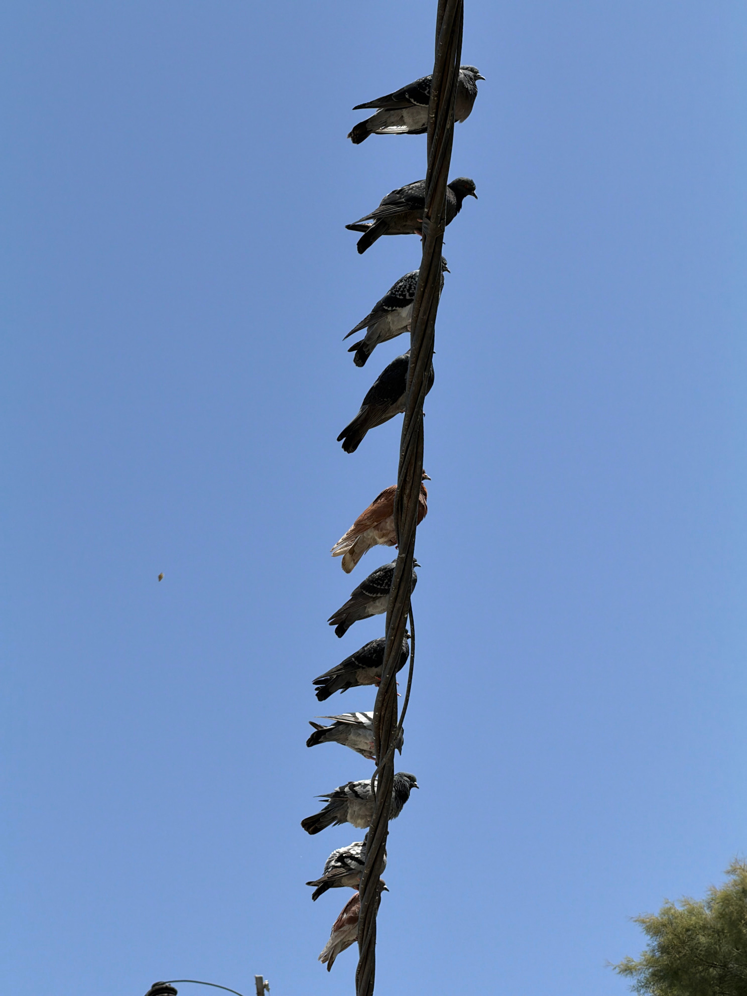 A low-angle shot shows a line of pigeons perched on an electrical wire against a clear blue sky. The pigeons face in different directions, with some facing forward and others turned to the side or sli…read more