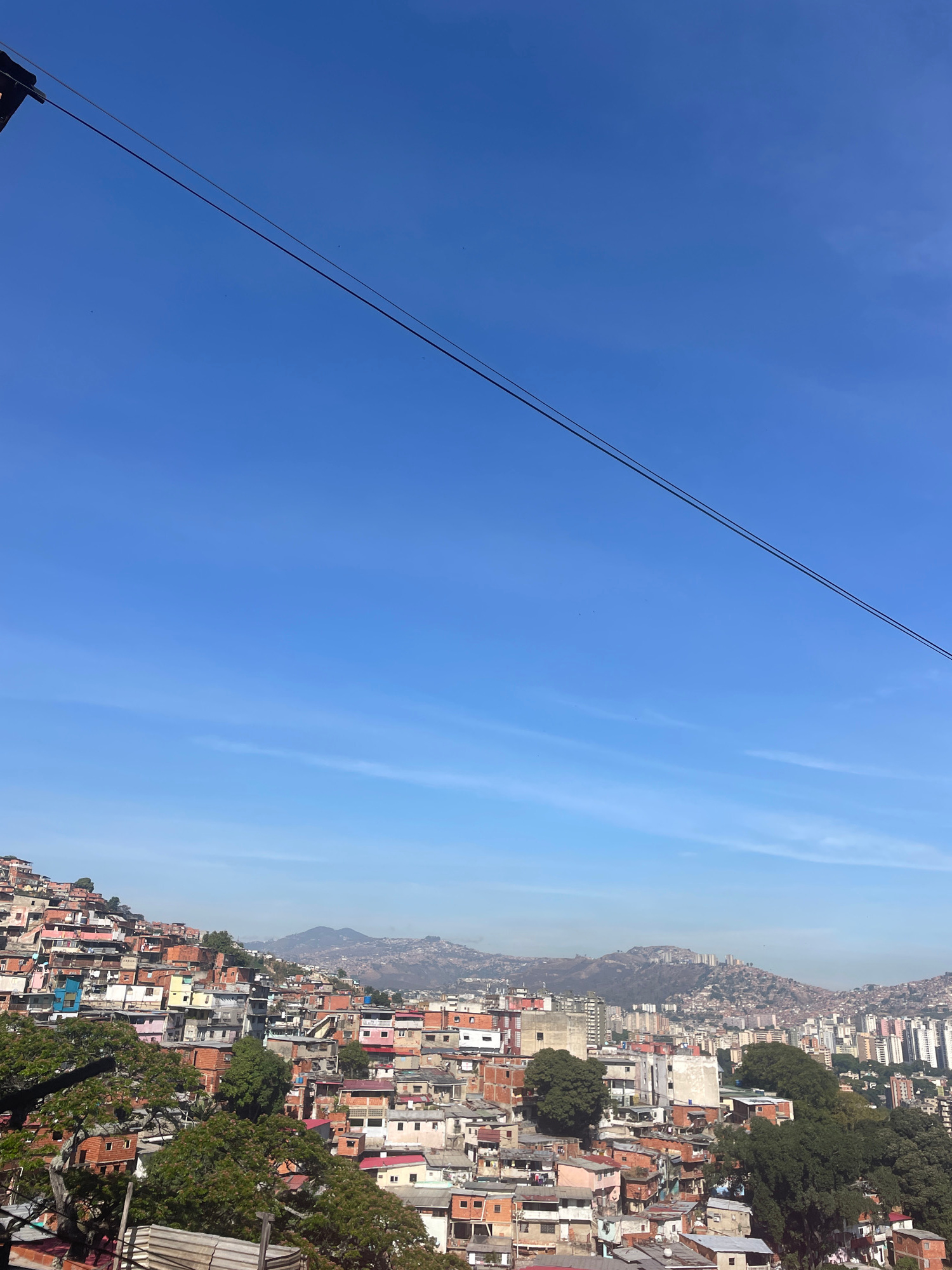The image presents a view of a densely populated area, a favela, in Caracas, Venezuela, under a clear blue sky. The cityscape is characterized by a patchwork of closely built houses, varying in colors…read more