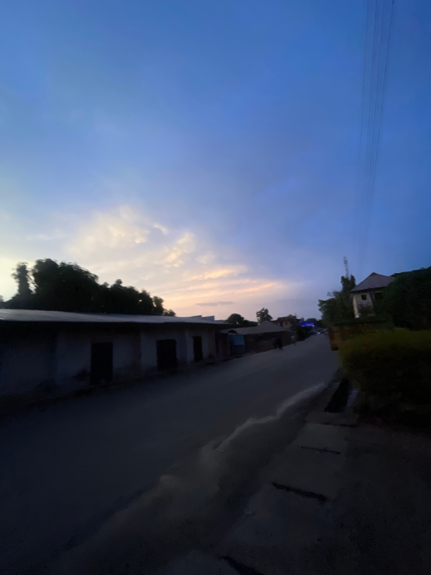 The image depicts an evening scene in Jos, Nigeria. A road stretches into the distance, flanked by buildings on one side and trees on the other. The sky is a gradient of blue and pale orange, possibly…read more
