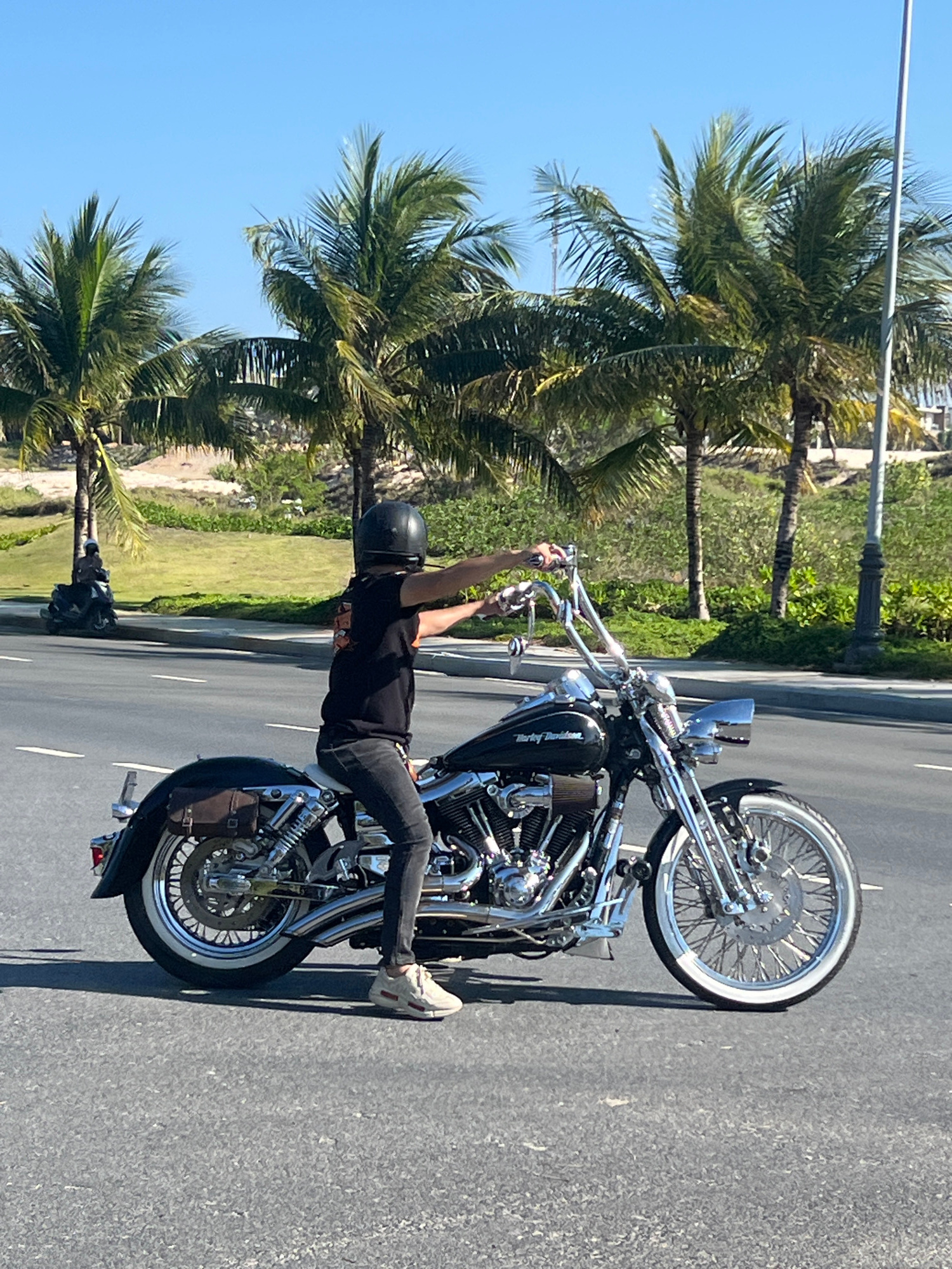 This image depicts an outdoor scene on a clear, sunny day in Cam Ranh, Vietnam. A person wearing a black helmet, black t-shirt with an orange graphic, dark jeans, and light-colored sneakers is positio…read more