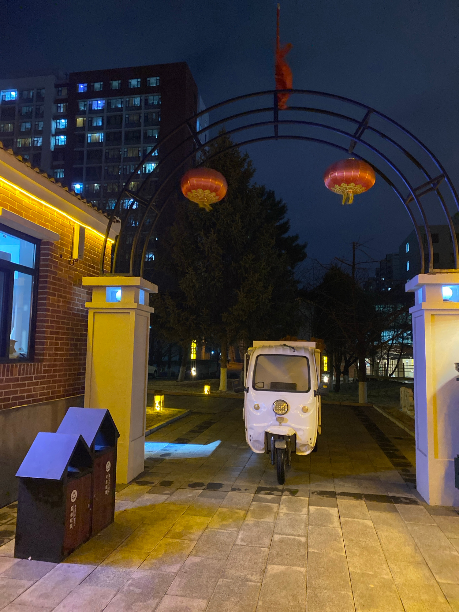 A nighttime view in Zhongtun, China, looking through an archway decorated with red lanterns. A white three-wheeled vehicle is parked beyond the archway. To the right is a paved walkway. In the foregro…read more