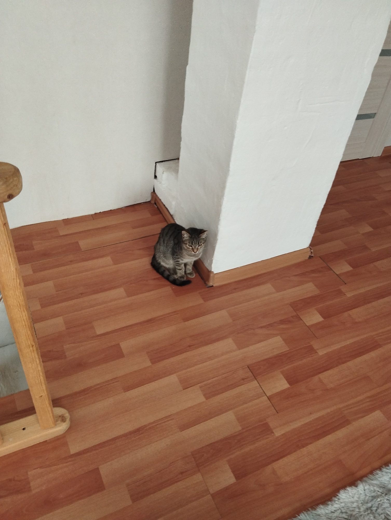 A tabby cat sits near the base of a white wall column on a brown, planked floor. The environment includes a wall with a wood railing on the left, and a door in the upper right corner. The flooring app…read more