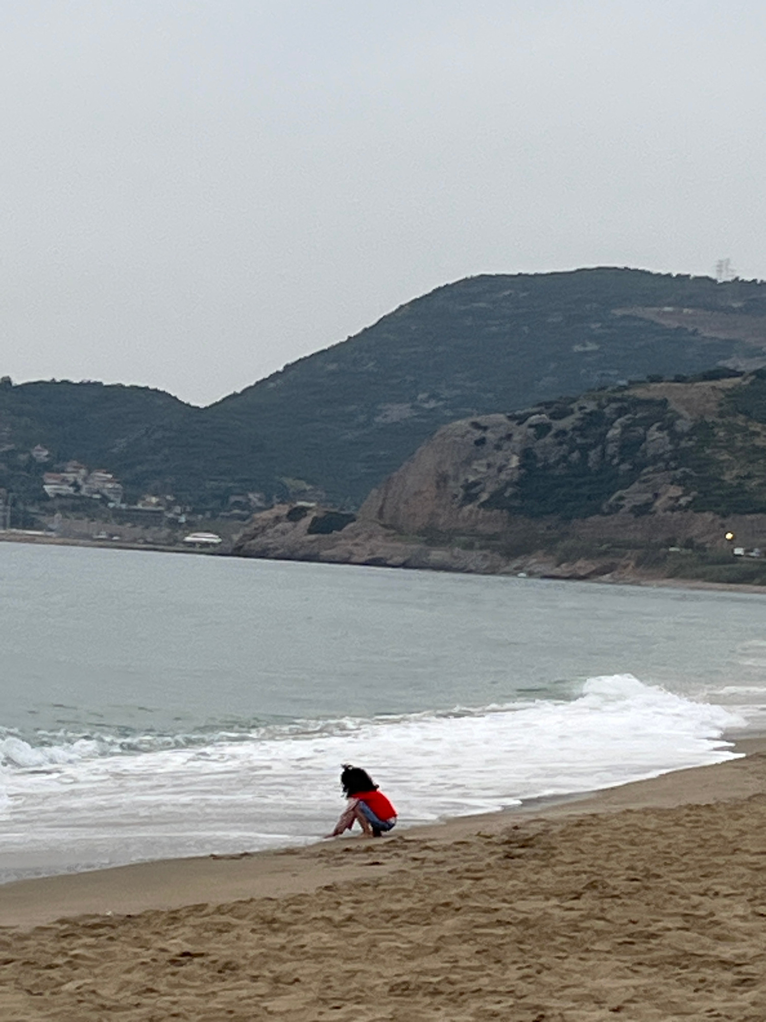 This image captures a serene coastal landscape, likely Alanya, Turkey, under an overcast sky. The scene is dominated by a sandy beach, the sea, and a prominent mountain range. In the immediate foregr…read more