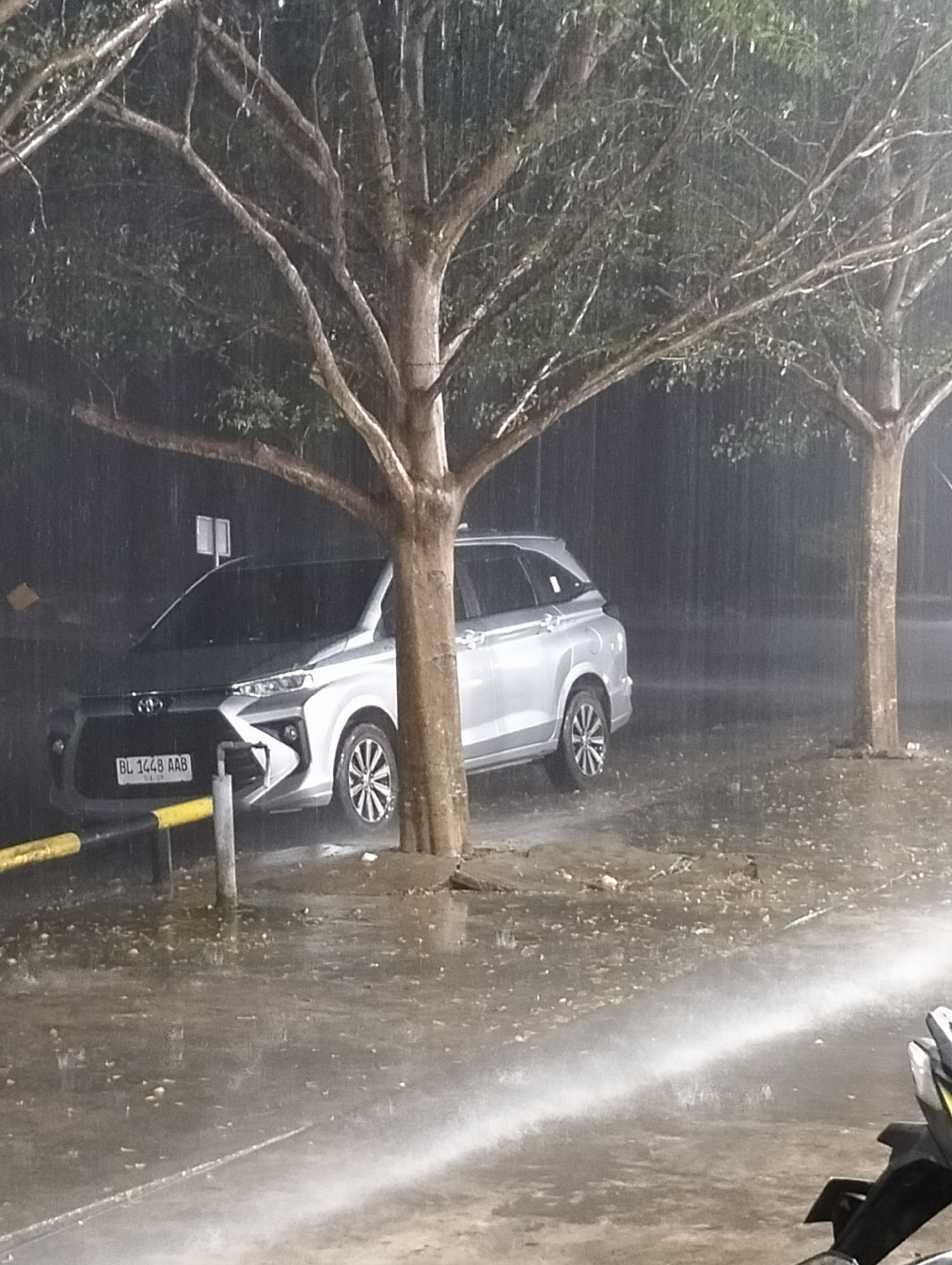 A silver Toyota Avanza is parked on a wet surface in Lhokseumawe, Indonesia, adjacent to a tree. It is raining heavily. The license plate reads "BL 1448 AAB". A yellow and black metal barrier is visibβ¦read more