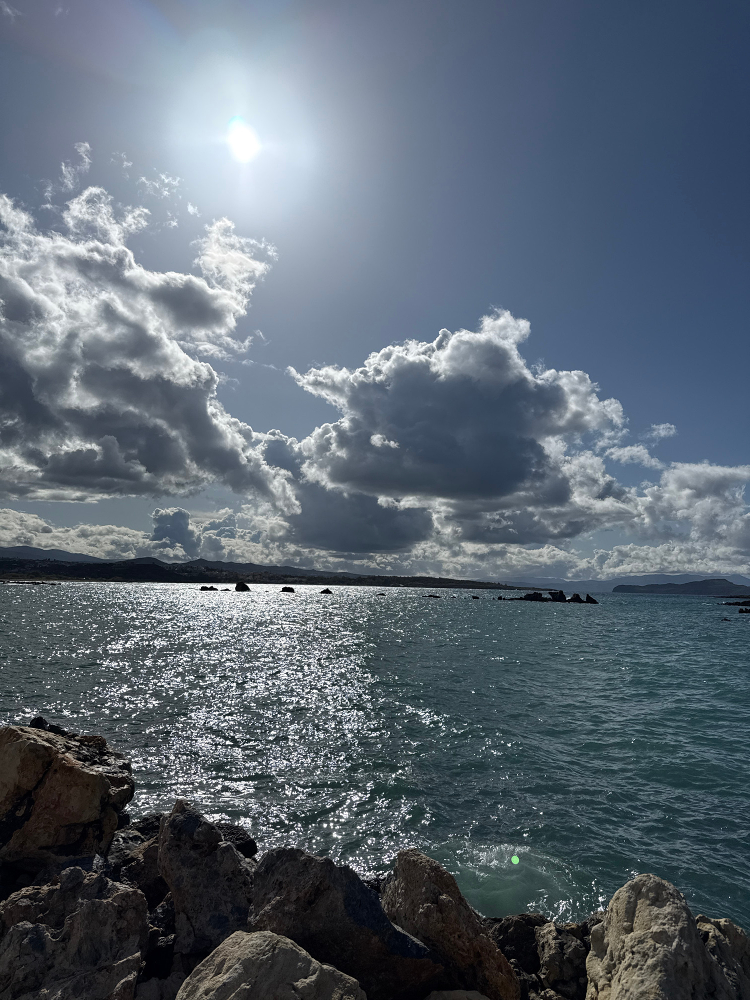 The image depicts a seascape in Chania, Greece. The right side of the frame shows a rocky shoreline abutting the sea. The water is reflecting sunlight, creating a shimmering effect on its surface. The…read more
