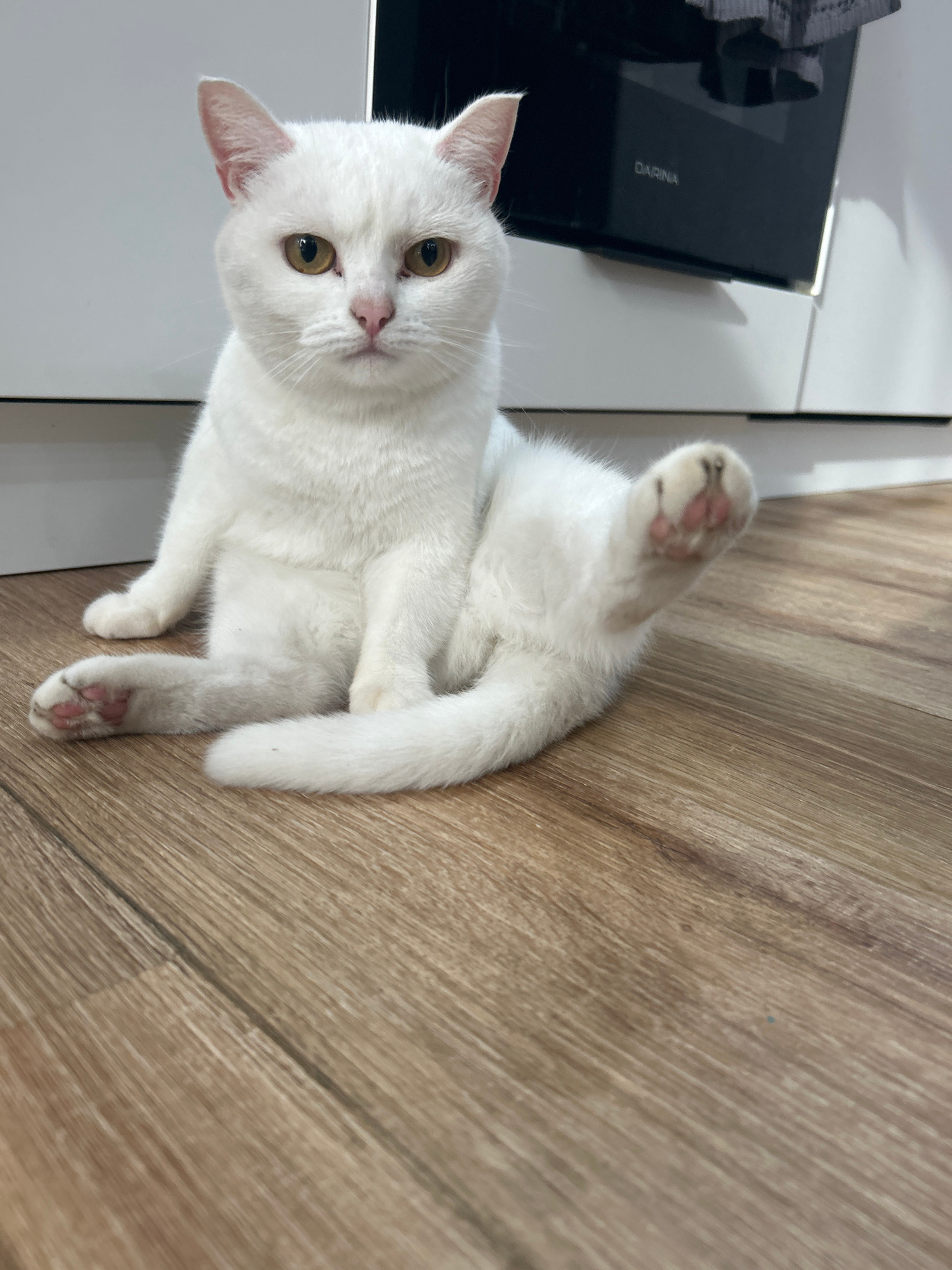 A white cat is captured in a close-up, indoor shot, lying on a light brown wooden floor. The cat has bright amber-gold eyes, a pink nose, and pink inner ears. Its fur is uniformly white and appears fl…read more