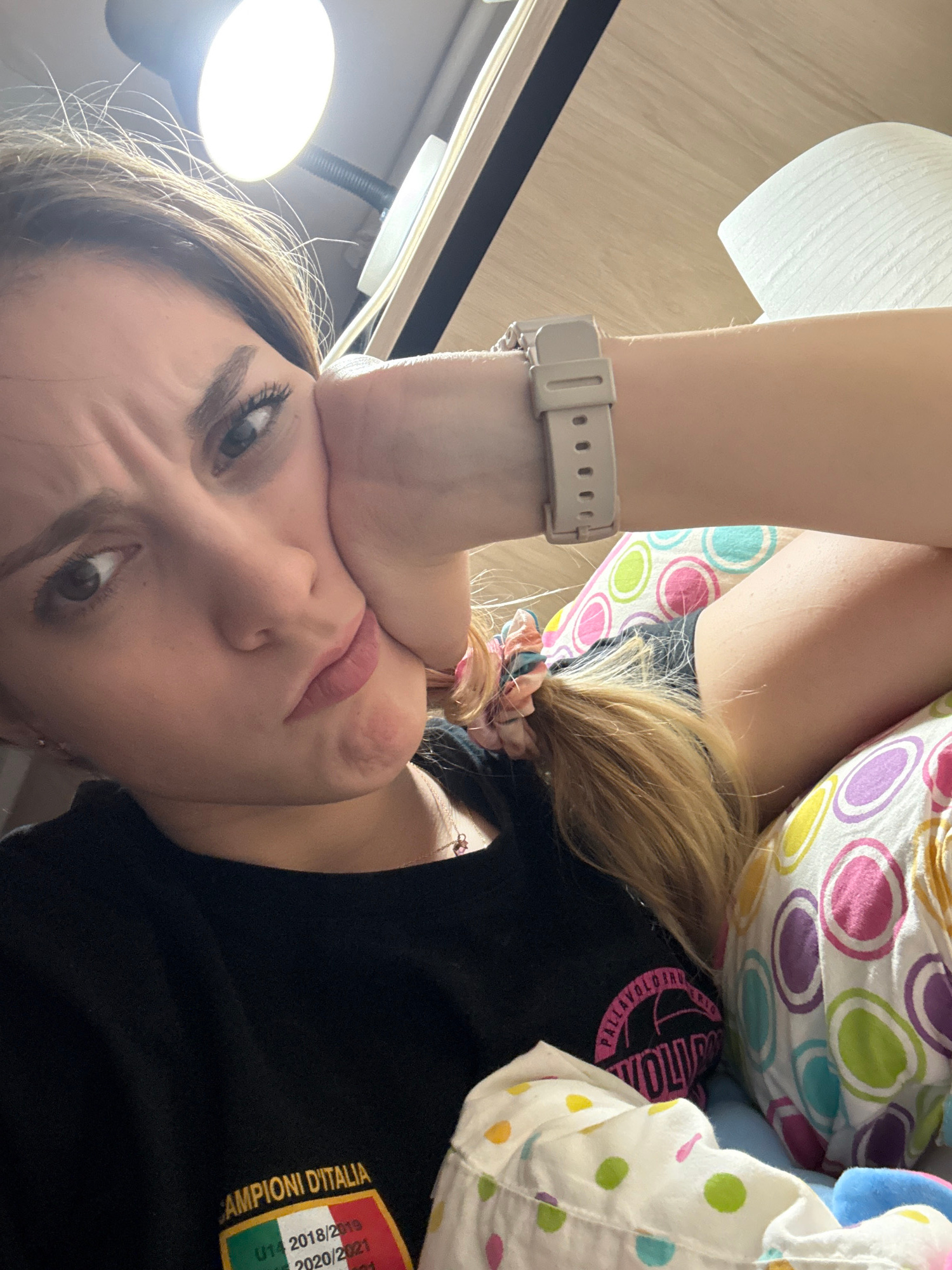 A close-up, angled selfie shows a young woman indoors. She has light skin, light brown hair pulled back with a scrunchie, and is wearing a light-colored digital watch on her left wrist. Her left hand…read more