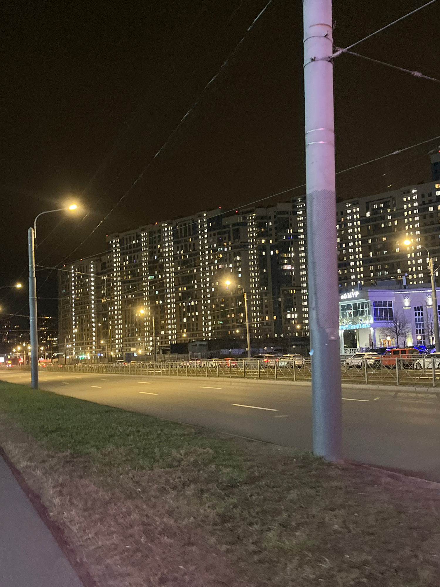 The image, taken at night, shows a view in Saint Petersburg, Russia. In the foreground, a metal structure or post dominates the scene, with cables extending from it. A road with white lines runs along…read more