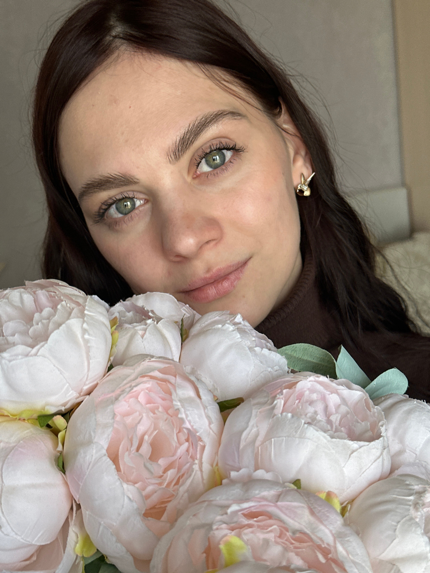 A woman with light skin, dark hair, and green eyes is positioned beside a bouquet of large, light pink and white peonies. She wears a brown turtleneck sweater and a gold earring in her left ear. The l…read more