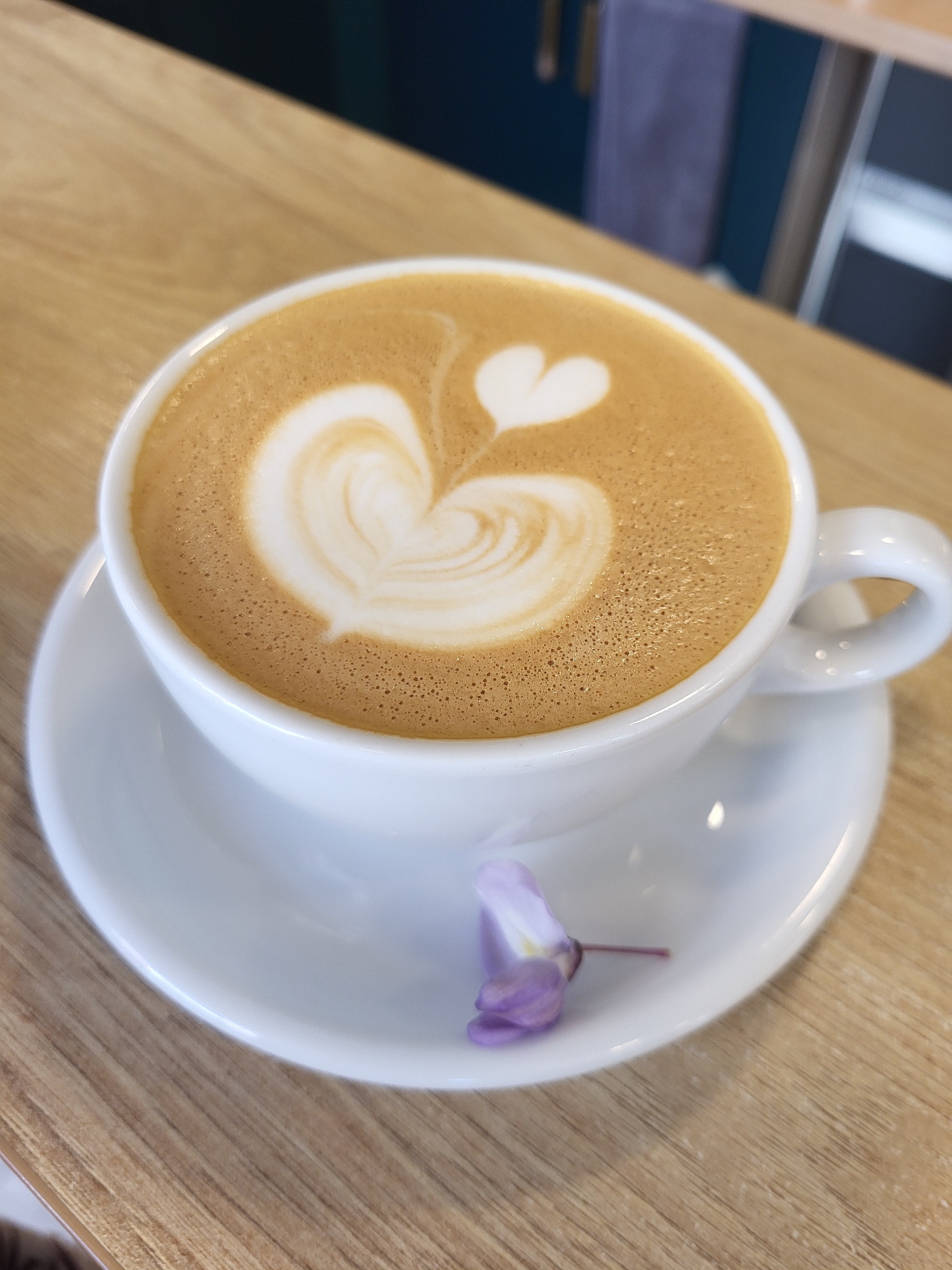 A high-angle close-up shot shows a cup of coffee with latte art placed on a white saucer, which also holds a single wisteria blossom. The coffee features a heart-shaped design in the milk foam. The cup and saucer are set on a wooden table with a light-colored, wood-grain surface. A glimpse of a blue and white surface is visible in the upper left corner of the frame. The location cannot be determined from the image alone. | Open Wire