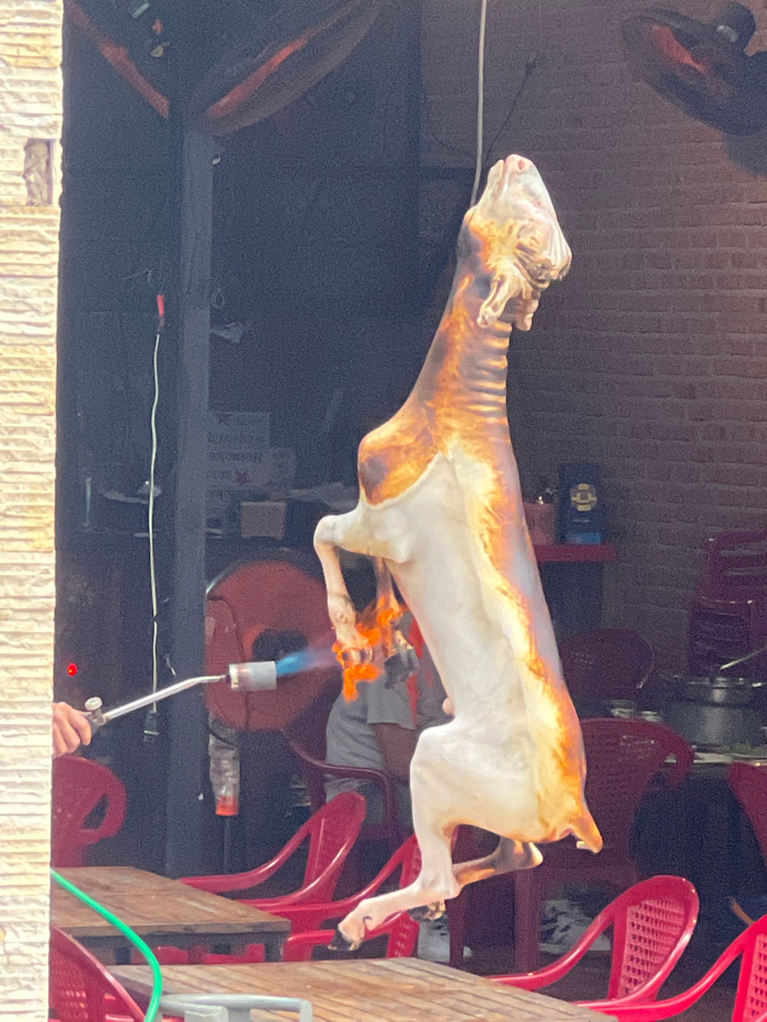 An outdoor food preparation scene in Nha Trang, Vietnam, displays a whole, skinned animal carcass, consistent with a goat, hanging vertically from an unseen overhead support. The carcass exhibits a mo…read more