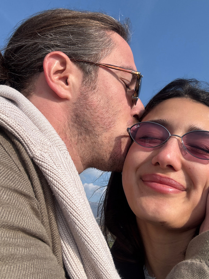 The scene is an outdoor setting in Šušanj, Montenegro, under a clear blue sky with some distant white clouds. Two individuals are depicted in a close-up, chest-up vertical frame. On the left, a male s…read more