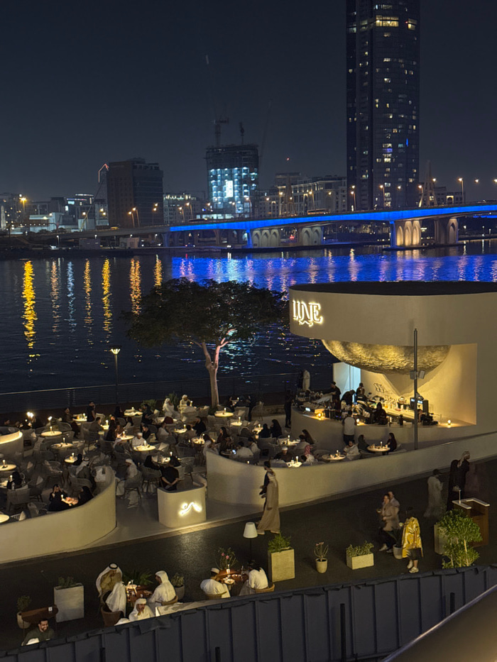 An outdoor restaurant or lounge sits next to a body of water, likely a river or bay. The establishment is bustling with patrons seated at numerous tables. Behind the restaurant, a cityscape is visible…read more