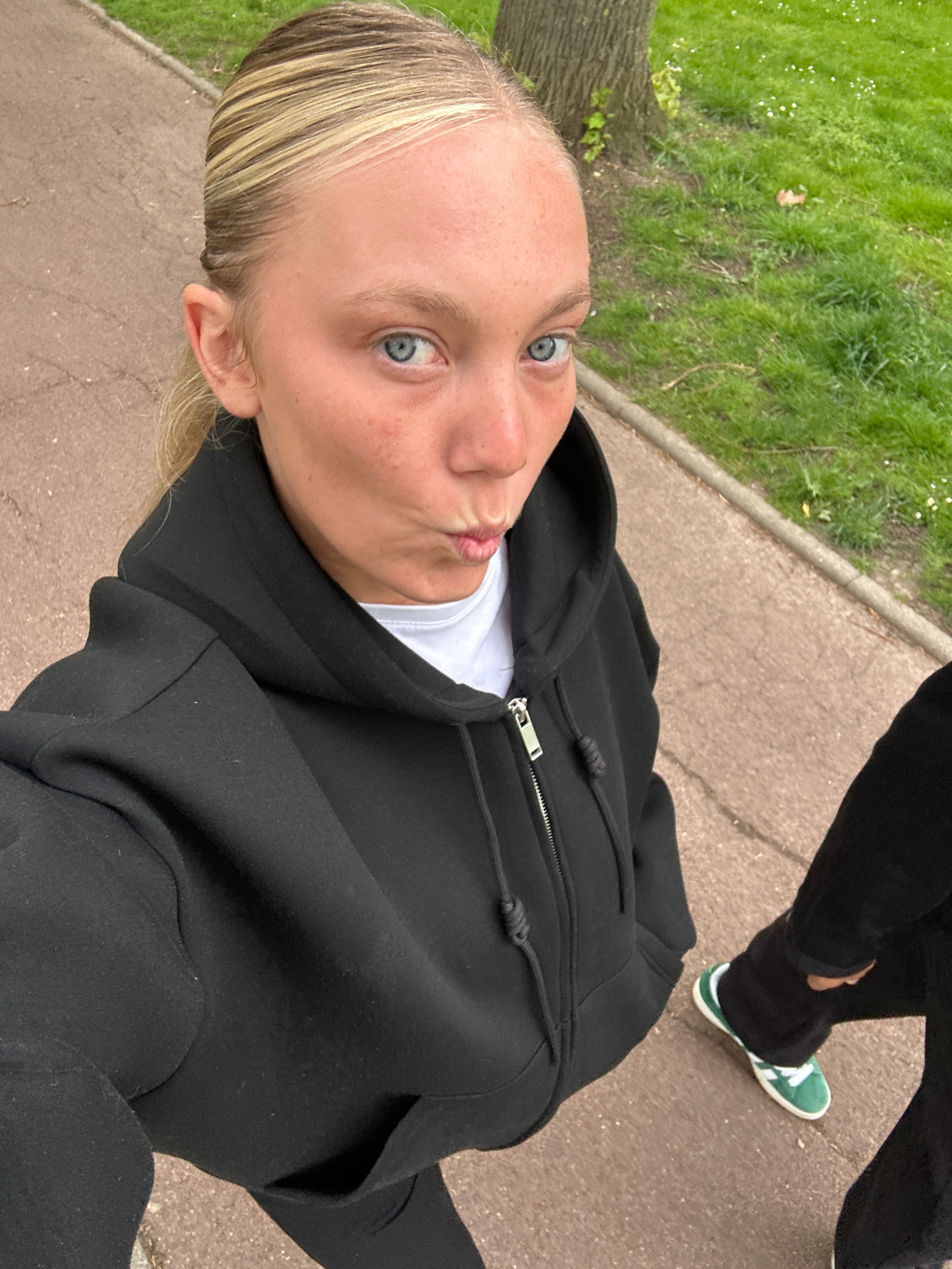 A young, light-skinned woman with blond hair and blue eyes is taking a selfie outdoors. She is wearing a white t-shirt under a black zip-up hoodie and black pants. She has puckered lips. Another perso…read more