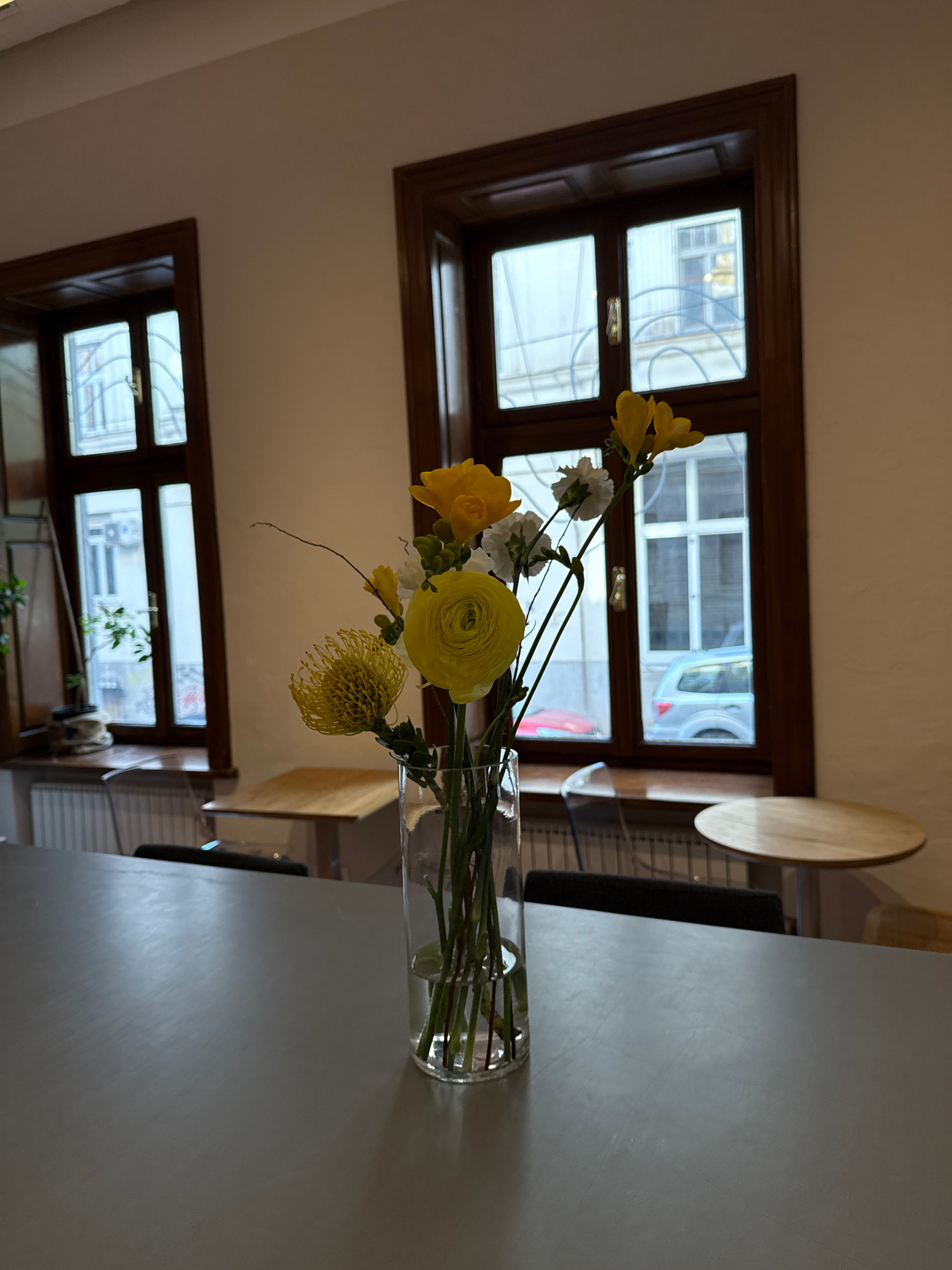The image displays an indoor scene, likely a cafe or a well-decorated room, bathed in natural daylight. In the foreground, a transparent glass vase holds a vibrant bouquet of yellow and white flowers.…read more
