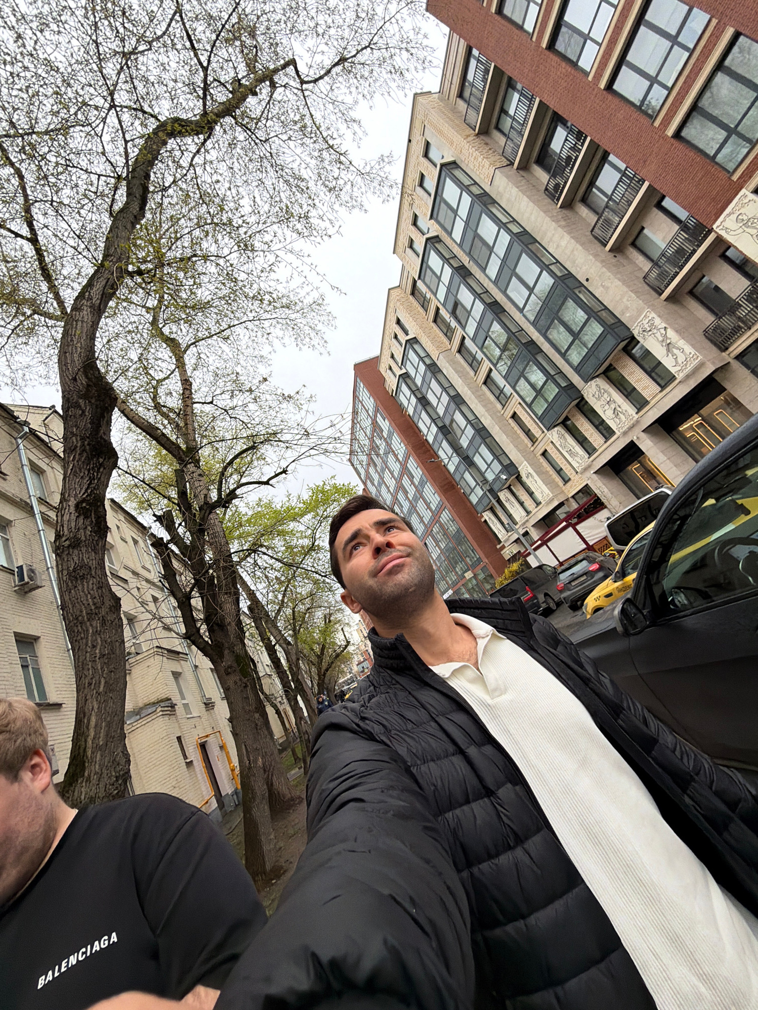 The image depicts a low-angle perspective of an individual taking a selfie in an urban environment. People: Two men are visible in the frame. One man, presumably taking the photo, is wearing a white…read more