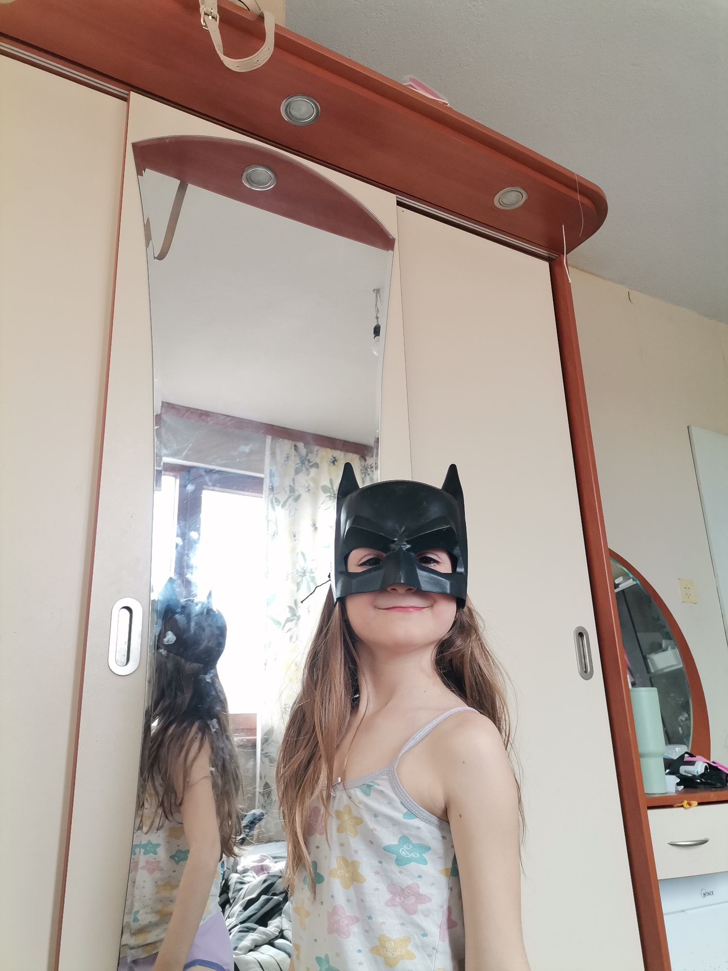 A young girl is posing for the camera in a room, wearing a Batman mask. She is standing in front of a closet with a built-in mirror. The mirror reflects her image and a window with a light filtering t…read more