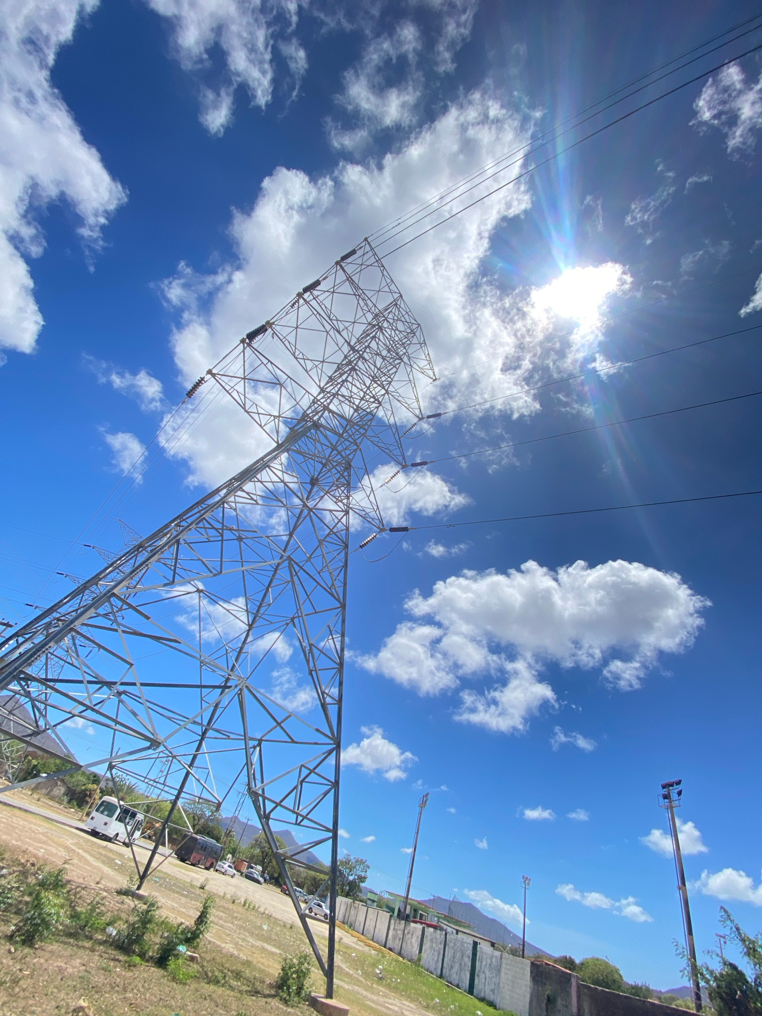The image shows a high-voltage power transmission tower in Juan Griego, Venezuela. The tower is made of a lattice of steel beams and is situated against a backdrop of a blue sky with scattered white c…read more