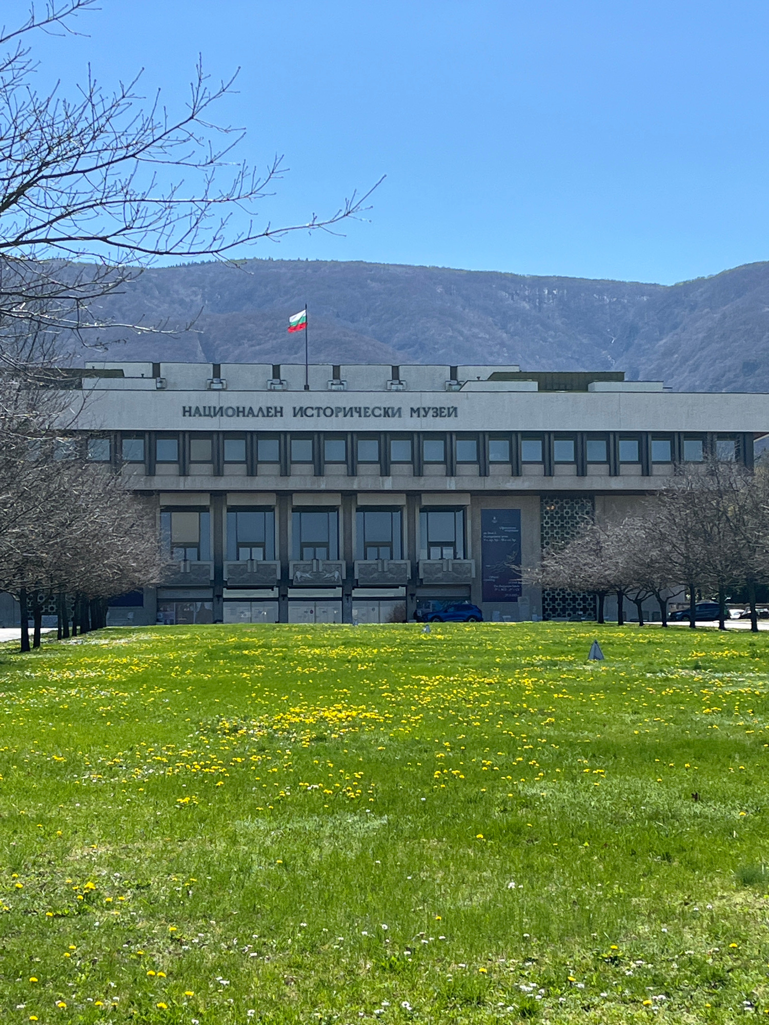 The image depicts the National Historical Museum in Sofia, Bulgaria. The building is a tall, modern structure with a symmetrical facade featuring numerous windows. The Bulgarian flag is flying promine…read more