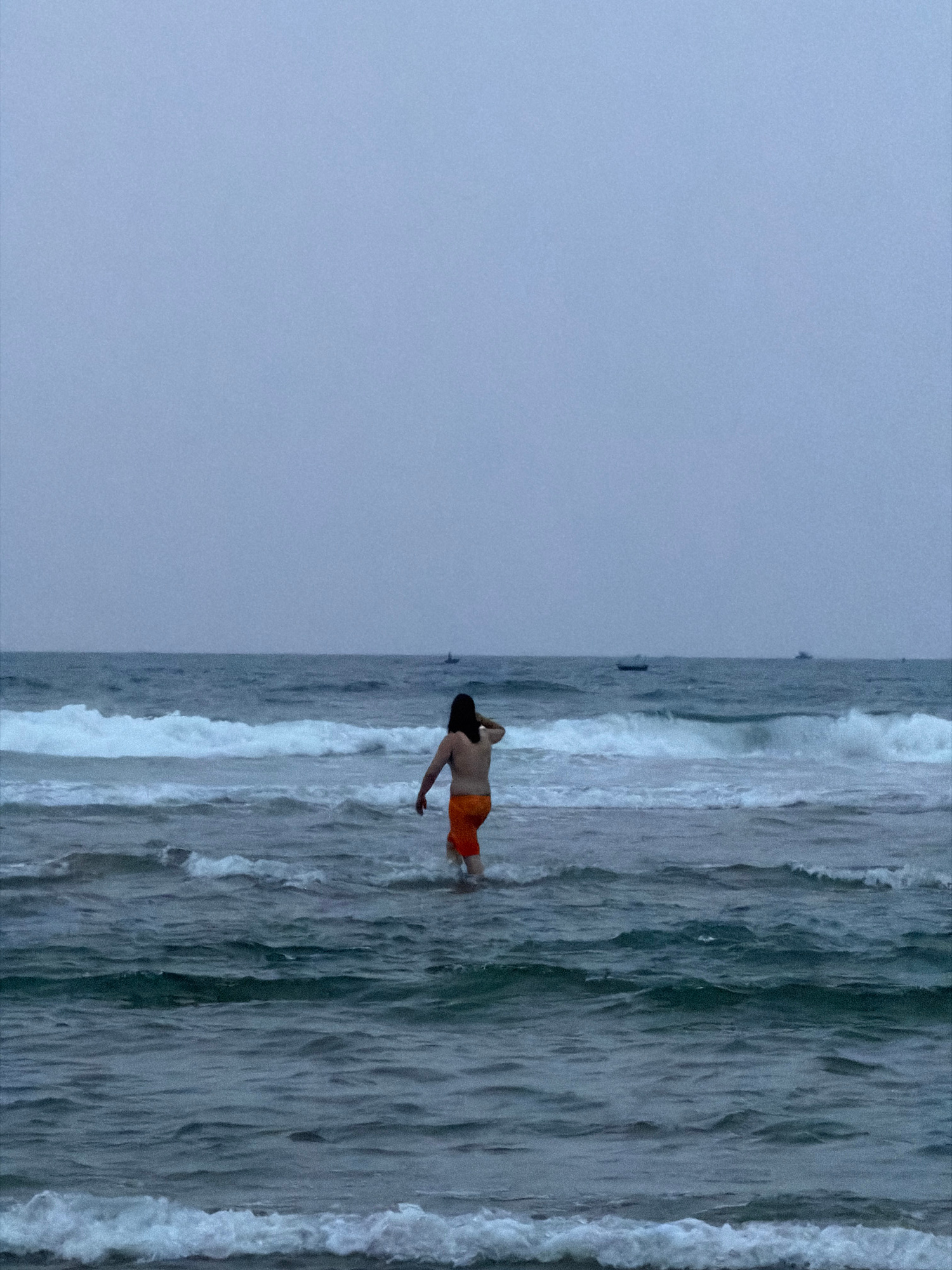The image shows a solitary person wading in the ocean under an overcast sky. The horizon line runs horizontally across the middle of the frame, dividing the muted grey-blue sky from the active sea. An…read more