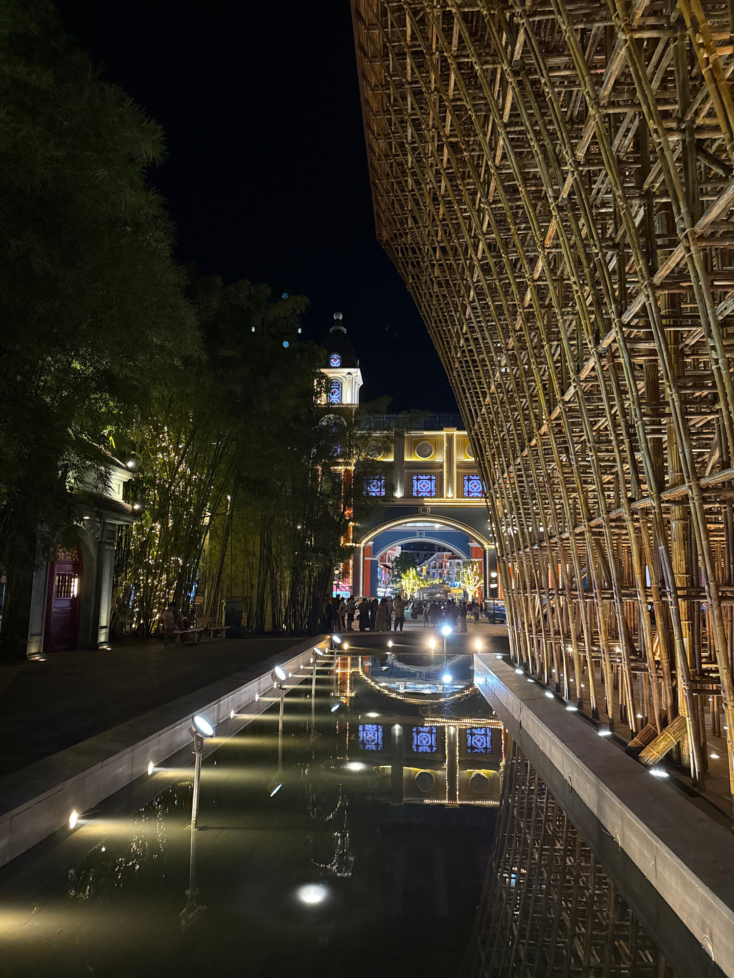 This image depicts a vibrant night scene at a beautifully lit tourist attraction in Phú Quốc, Vietnam. The most prominent feature is a massive, intricately woven structure made of bamboo poles, formin…read more