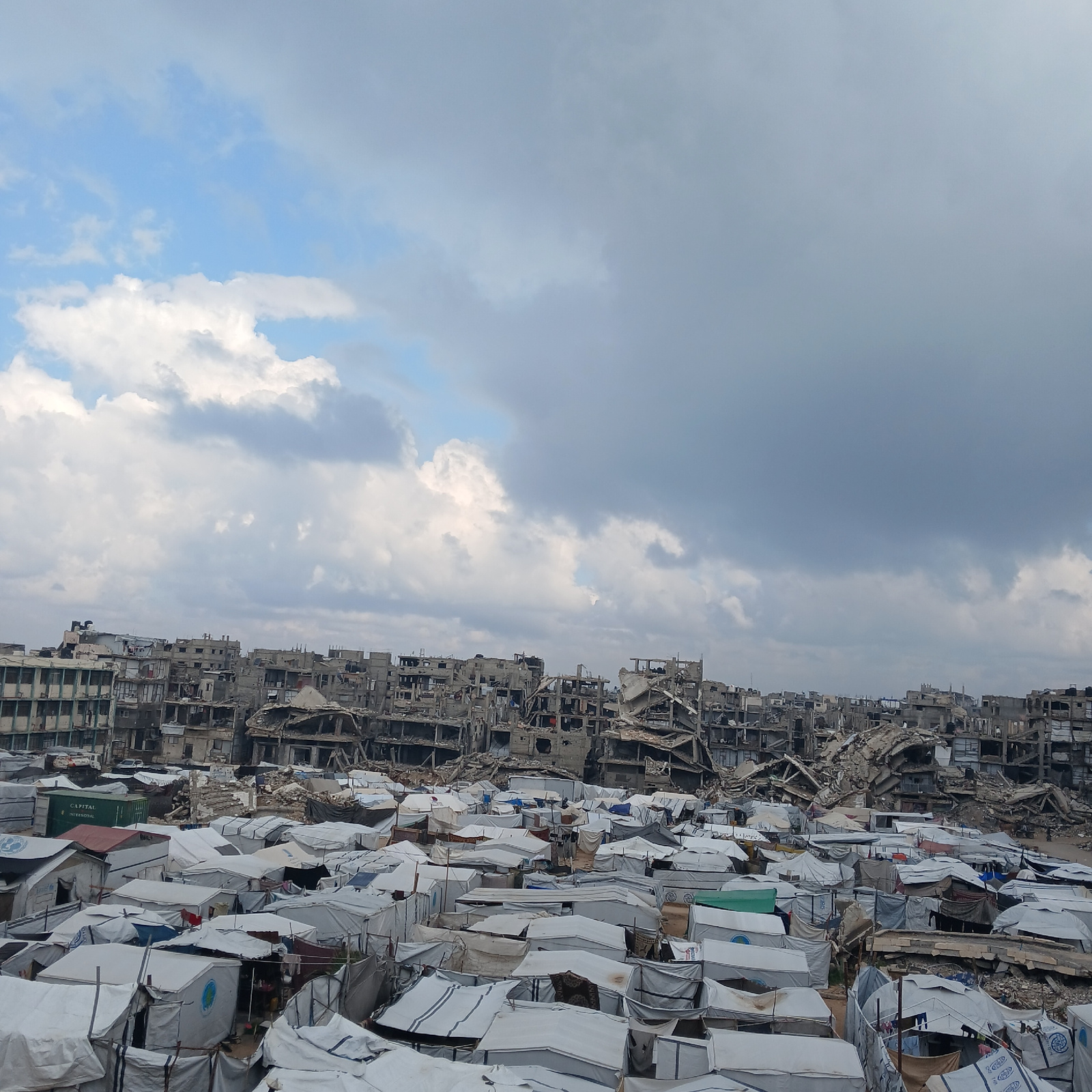 The image shows a scene of devastation in Gaza, Palestinian Territory. On the right side of the image, there is a large area filled with tightly packed white tents, possibly a refugee camp. Adjacent t…read more