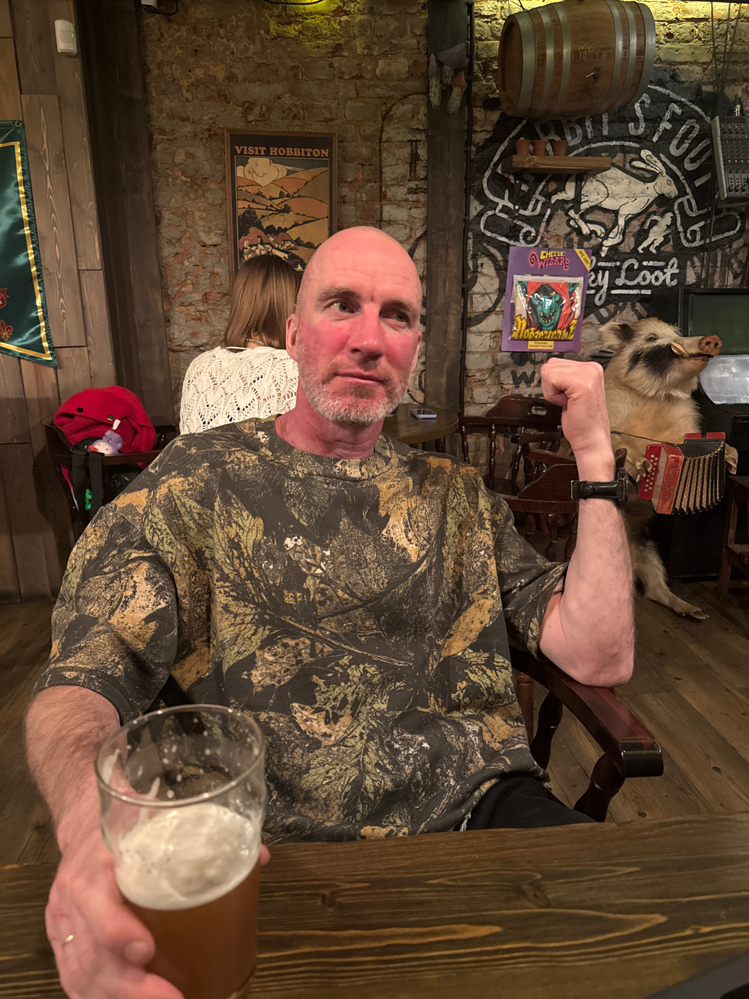 The image shows a man sitting at a wooden table, holding a pint of beer. He is wearing a camo-patterned shirt and a black wristwatch. The background includes a wall with exposed brick and wooden panel…read more