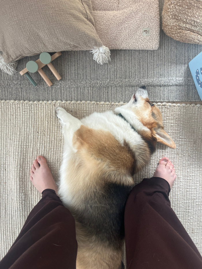 An overhead view within an indoor setting in Gangloff, Germany, depicts a tricolor Corgi dog lying on its back, stretching, with its head tilted upward. The dog's white, tan, and black fur is visible,…read more
