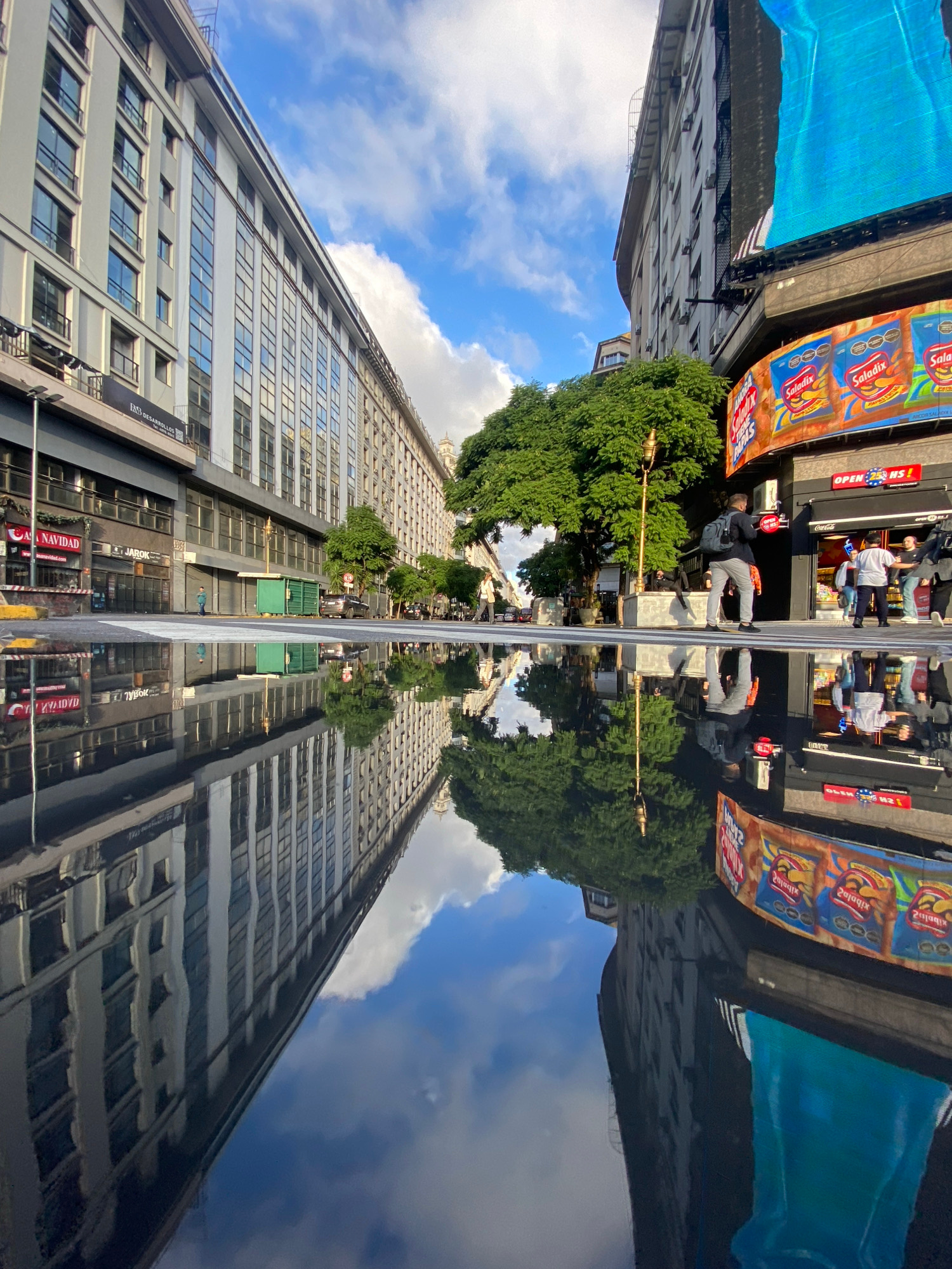 The image displays an urban street scene, likely in Buenos Aires, Argentina, characterized by a striking horizontal reflection that creates a unique symmetrical composition. A dark, highly reflectiveβ¦read more