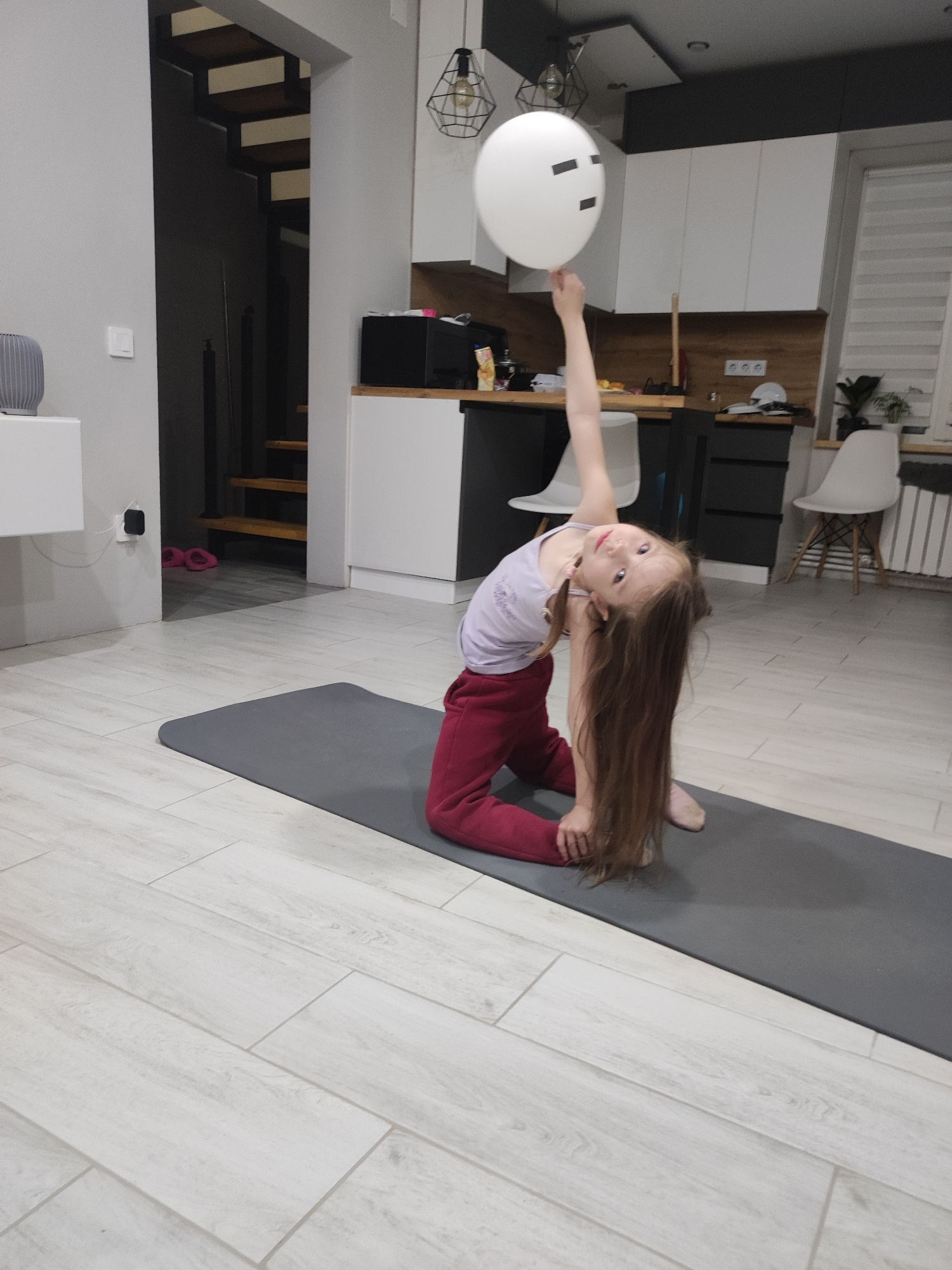 A young girl is performing a yoga pose on a gray mat indoors. She's kneeling with her torso twisted to the side, one arm raised and holding a white balloon with black tape forming a crude face. She is…read more