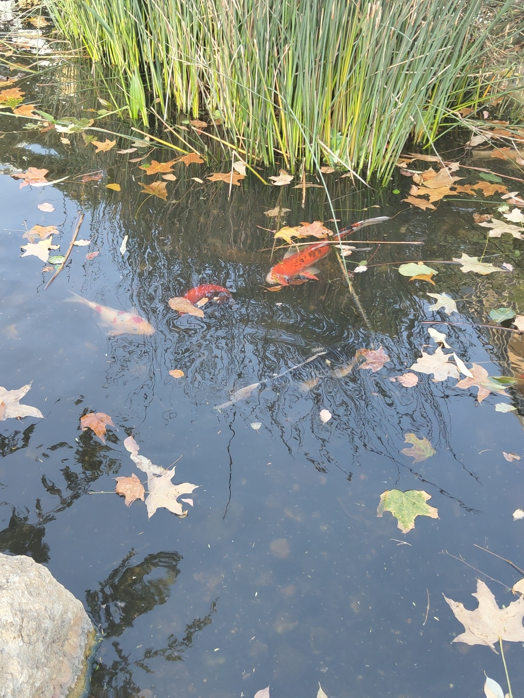 The image depicts a pond with koi fish swimming amongst fallen leaves. Lush green reeds grow on the left edge of the pond. The water's surface reflects the sky and surrounding vegetation. A rock is vi…read more