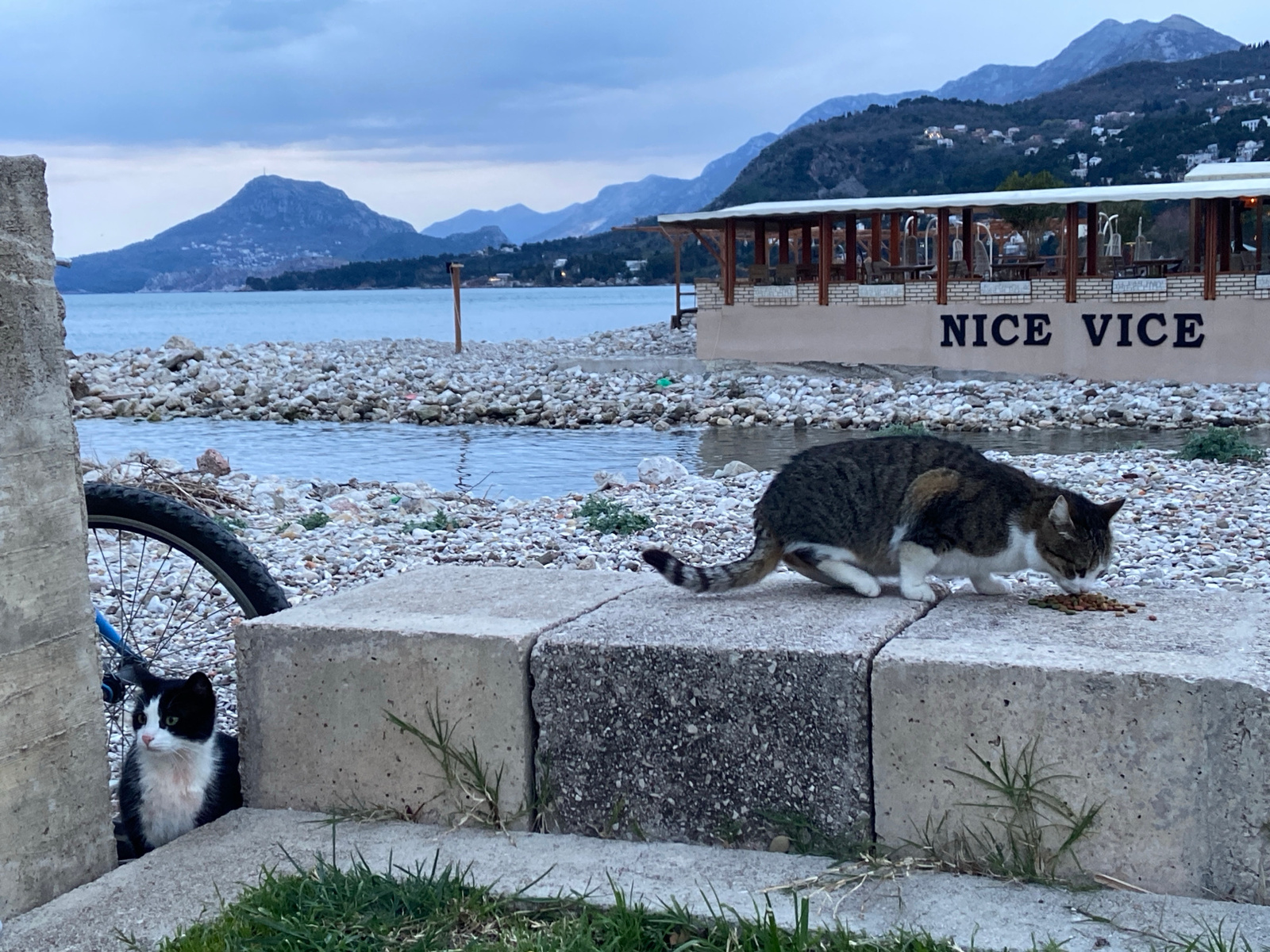 The photograph depicts a coastal scene in Bar, Montenegro. In the foreground, a tabby and white cat eats food placed on top of concrete blocks. Partially obscured behind a concrete block and bicycle w…read more