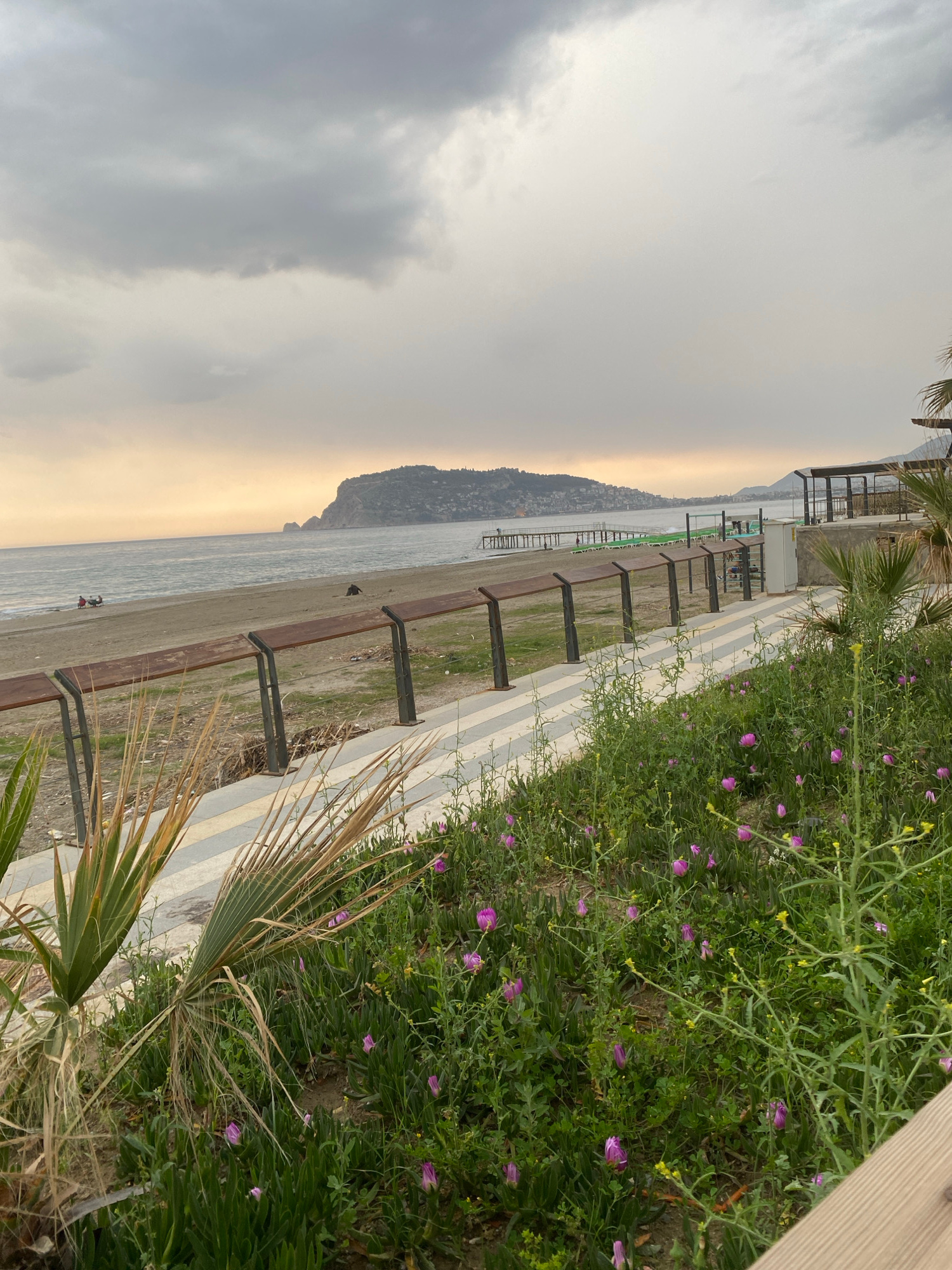 The image shows a view of the beach in Alanya, Turkey on an overcast day. The beach is sandy and meets the water's edge. A pathway runs along the beach, separated from the sand by a small strip of gra…read more