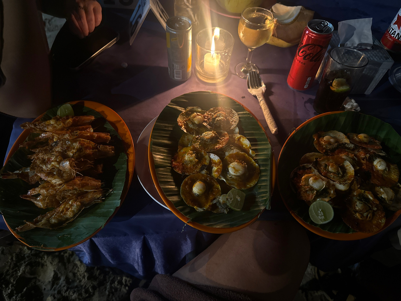 The scene is a dimly lit outdoor dining area, likely on a beach in Kuta Selatan, Indonesia. A table covered with a blue tablecloth holds three orange-rimmed plates, each featuring a different seafood…read more