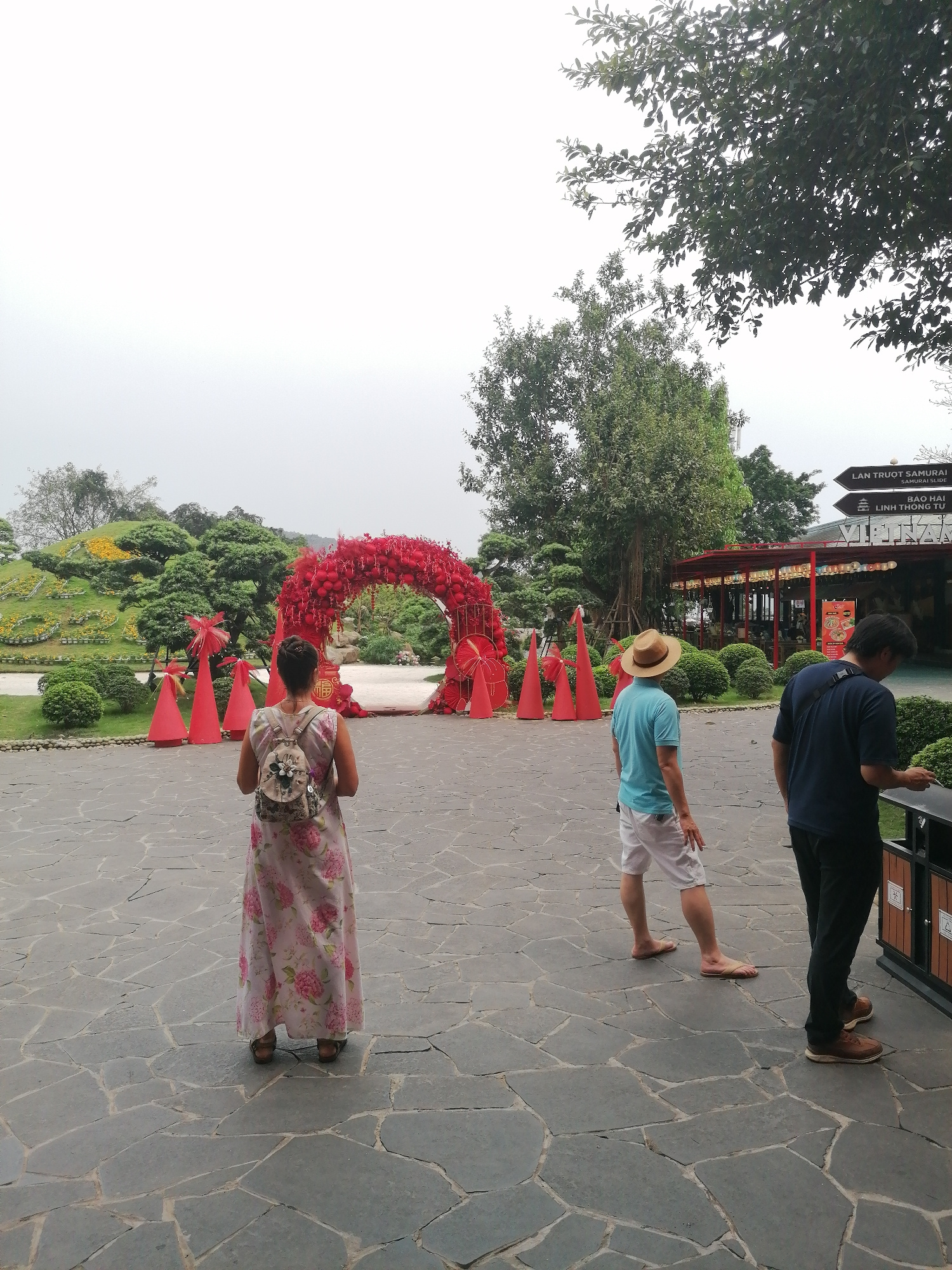 A wide shot captures a courtyard scene at the Lan Truot Samurai Samurai Slide destination in Hong Gai Ward, Vietnam. A woman in a floral print dress and backpack faces a red-decorated archway with con…read more