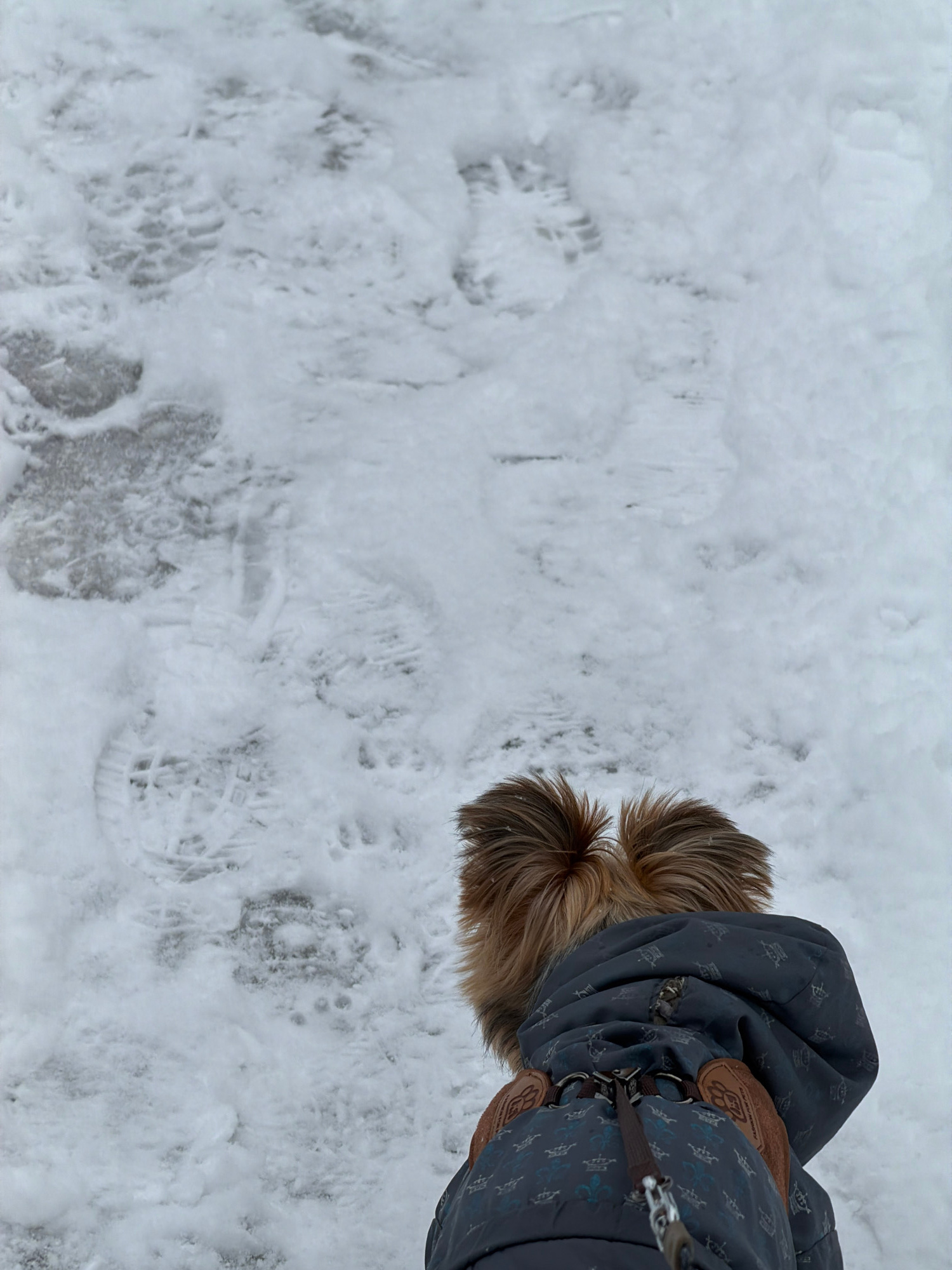 A high-angle shot shows a snow-covered path. Footprints and paw prints are visible in the snow. A dog is wearing a patterned jacket. The location is Izhevsk, Russia.