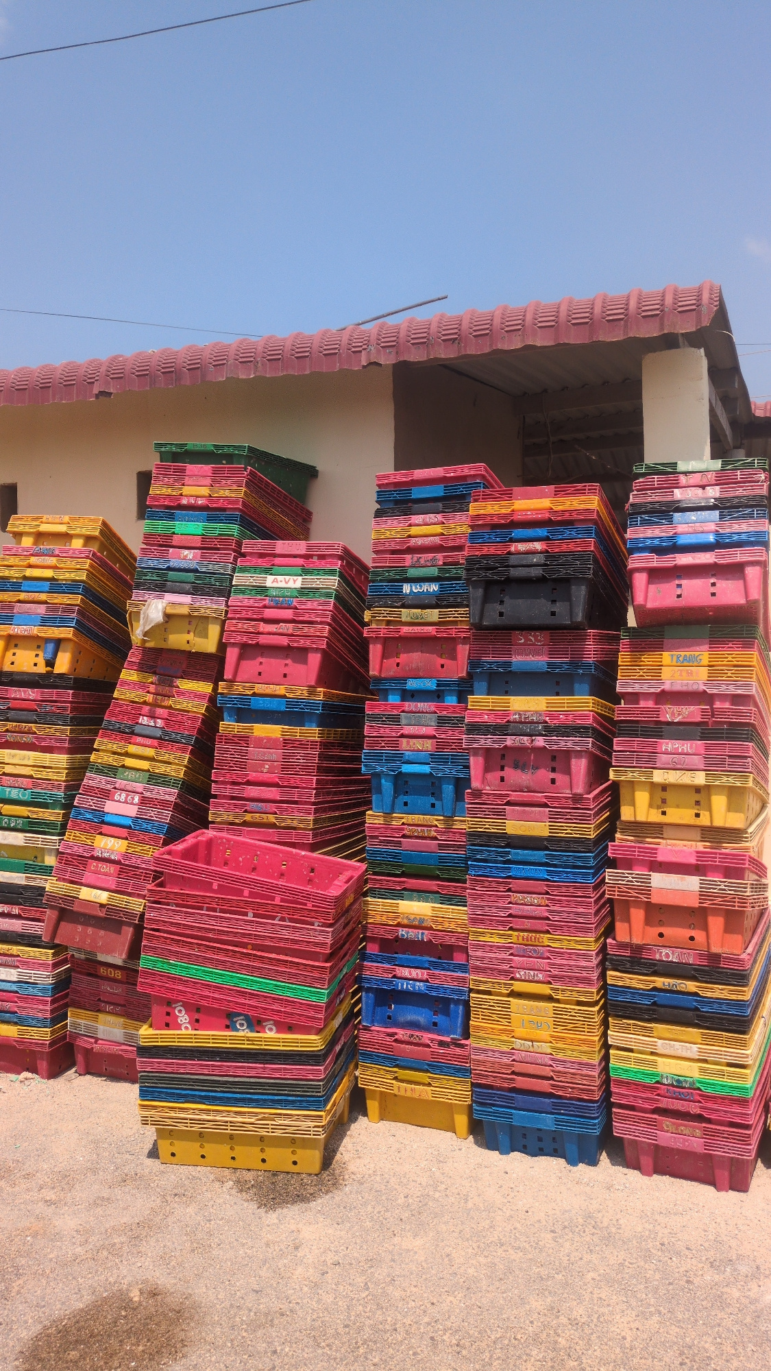The image depicts stacks of colorful plastic crates in what appears to be Phước Dinh, Vietnam, given the prompt's reference to this city. The crates, primarily red, yellow, blue, and green, are stacke…read more