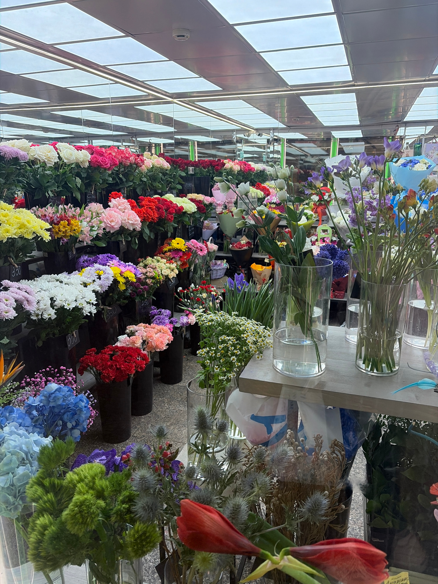 The image depicts a floral display in what appears to be a florist shop or market stall. Rows of flowers in various colors (yellow, white, pink, red, purple, blue, etc.) are arranged in black containe…read more
