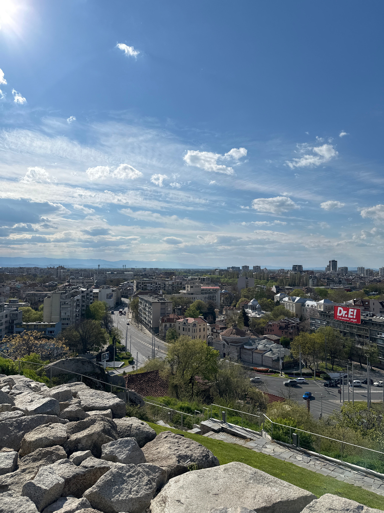 The image shows a cityscape view from a high vantage point in Plovdiv, Bulgaria. The sky is blue with scattered cumulus clouds. Below, a densely populated urban area unfolds with buildings of varying…read more