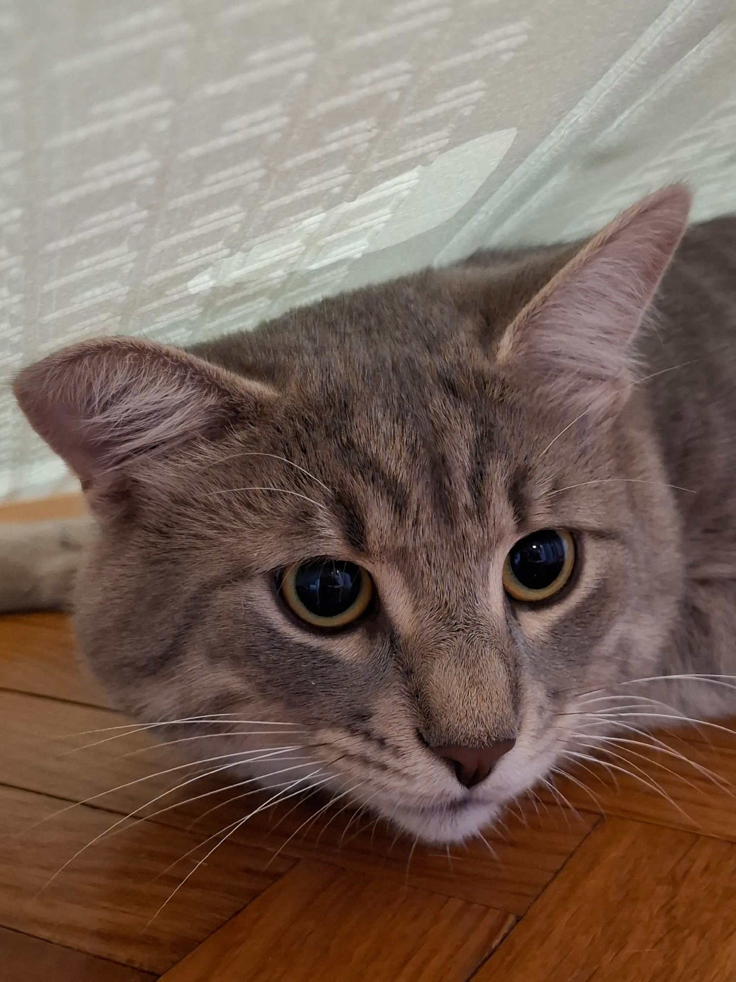 A close-up, eye-level shot captures a gray tabby cat looking directly at the camera with a curious and alert expression. The cat's prominent features include large, round black pupils with greenish-ye…read more