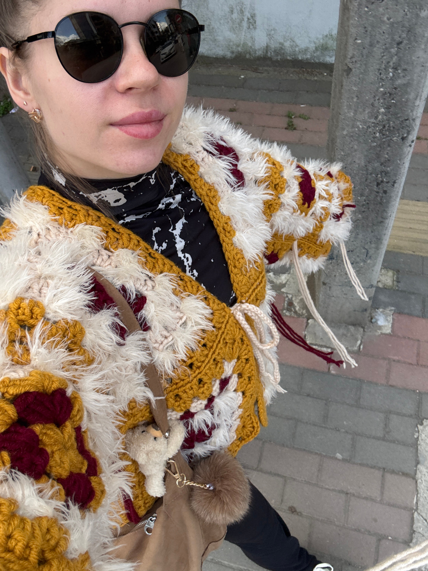 A person, presumably a young woman, is the primary subject of the image, taken in an elevated, tilted, close-up selfie perspective. She is wearing black sunglasses, and her face is partially visible,…read more