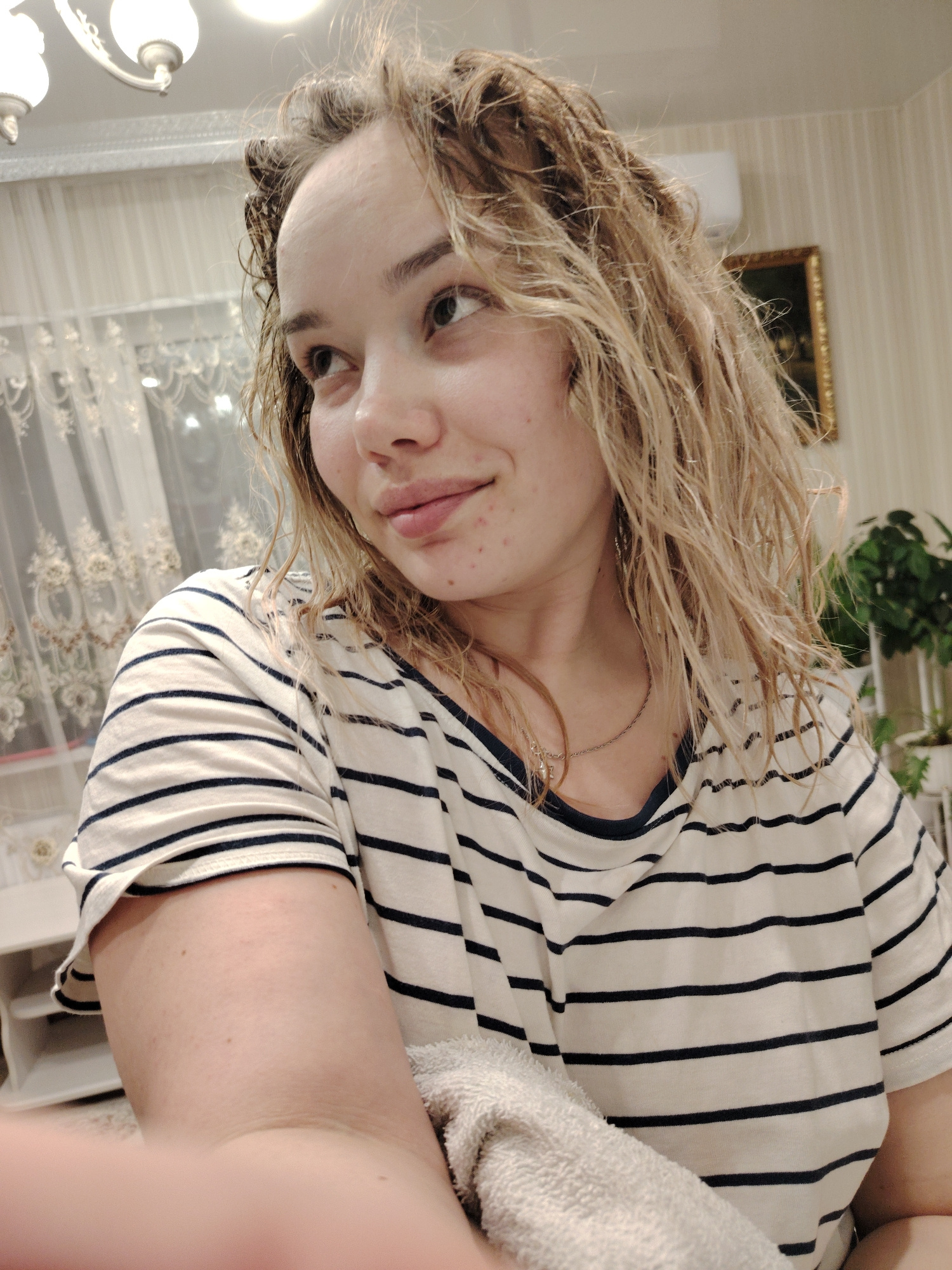 A selfie of a young Caucasian woman with wet, light brown, curly hair is presented indoors. She is wearing a striped white and black t-shirt. A silver necklace is visible around her neck. She looks of…read more