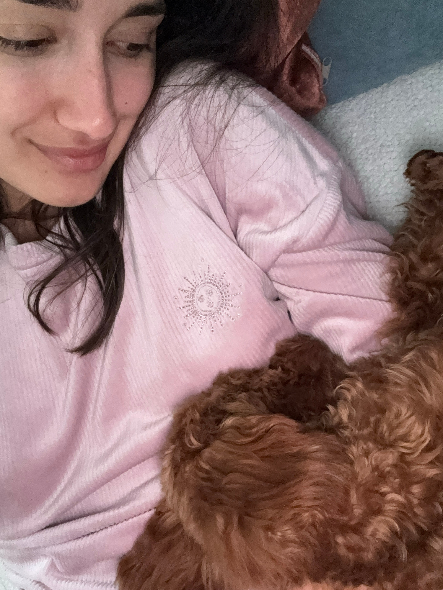 A woman is lying down with a brown dog on her pink shirt. The background includes a light blue pillow and part of a brown object. The location of the photo is not discernible.