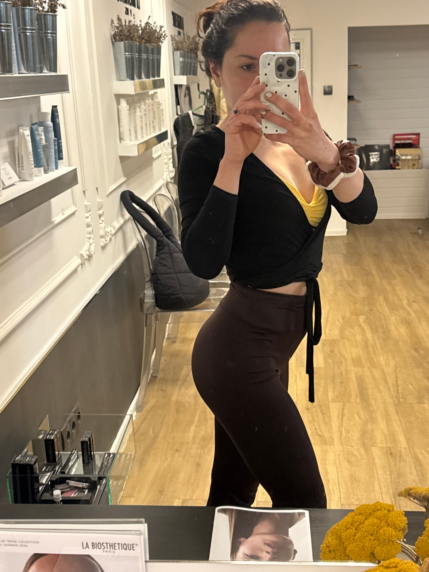 This image captures an indoor mirror selfie, likely taken in a beauty salon or cosmetics store in Burgas, Bulgaria. The photograph is rotated 90 degrees counter-clockwise. The primary subject is a yo…read more