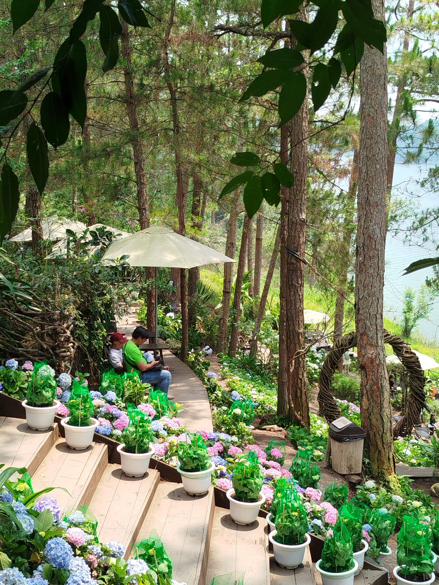 The image depicts a serene outdoor setting in Da Lat, Vietnam. A pathway lined with wooden steps is adorned with potted hydrangeas in shades of blue, pink, and white, along with plants covered in gree…read more