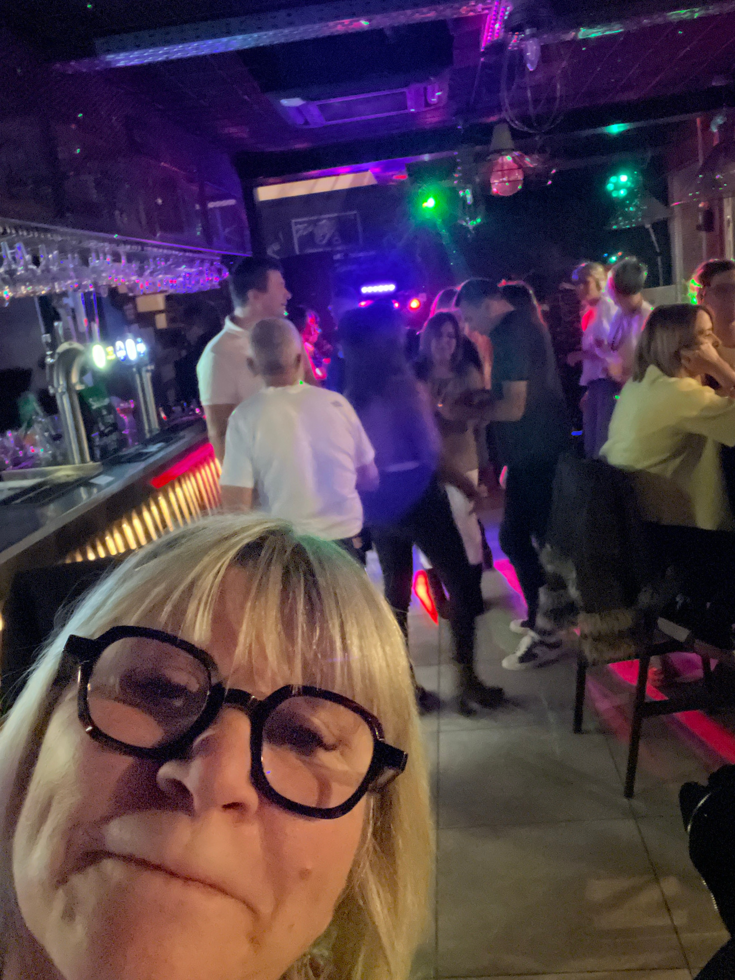 A woman with blonde hair and black-rimmed glasses is in the foreground, seemingly taking a selfie. Behind her, a crowded bar is visible. There are people dancing near disco balls and colorful lighting…read more