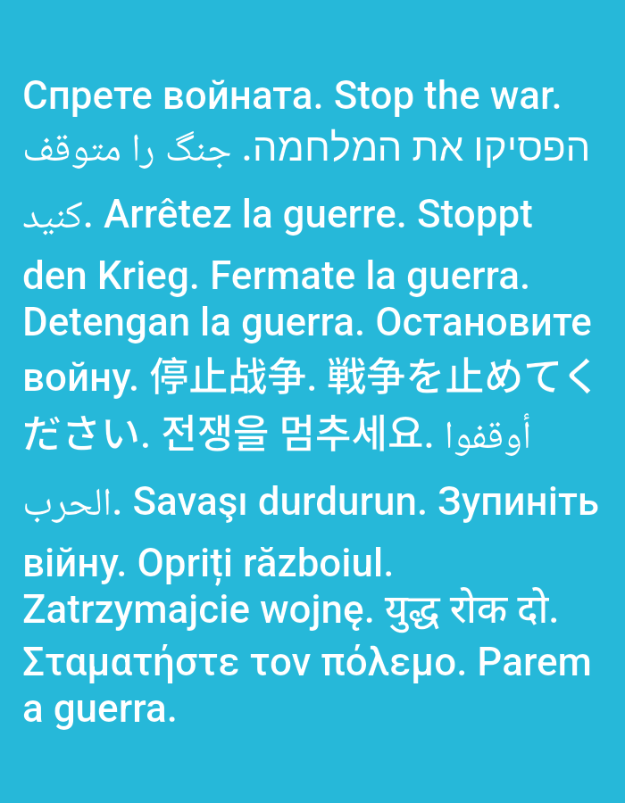 The image displays the phrase "Stop the war" written in multiple languages, including Bulgarian, English, Hebrew, Persian, French, German, Italian, Spanish, Russian, Chinese, Japanese, Korean, Arabic,…read more