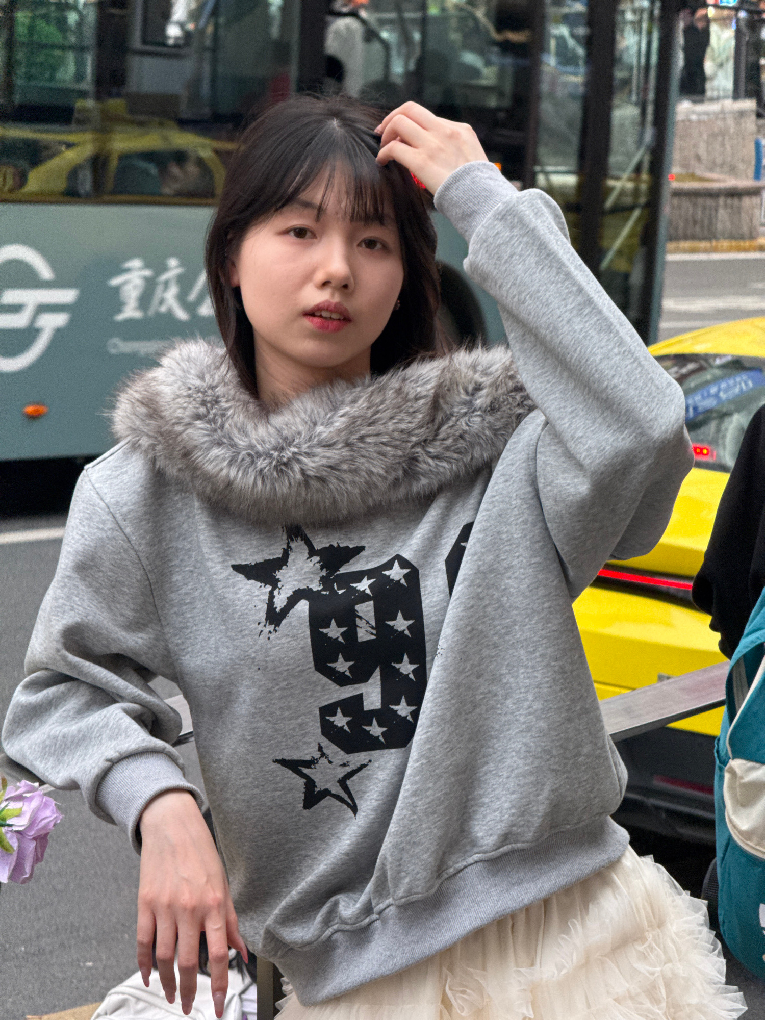 A young woman is seen in an urban setting, standing near a street, possibly in Liangjiang, China. She is wearing a gray sweatshirt with a fur collar and an American flag design, along with a white tul…read more