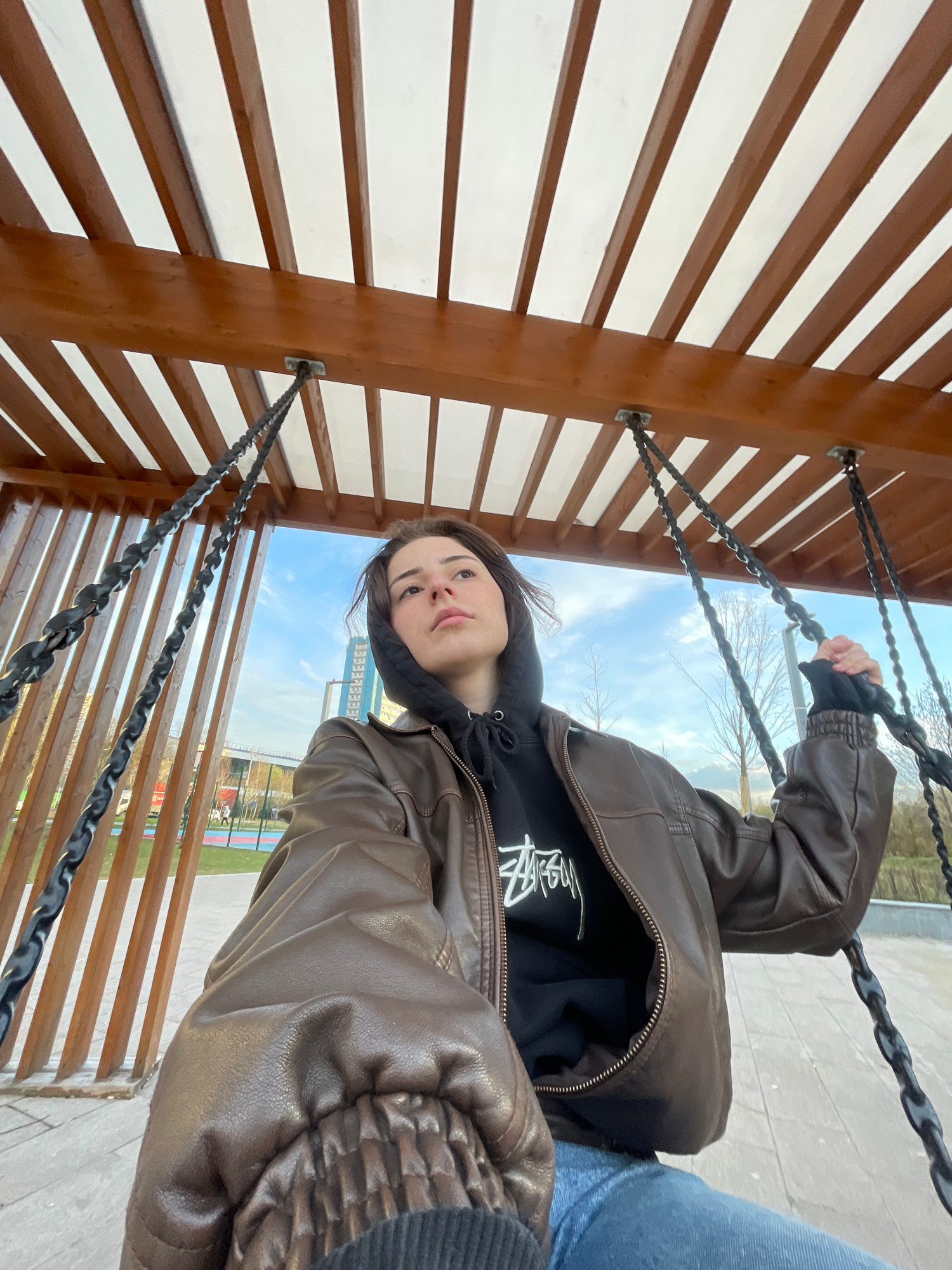 A woman is sitting on a swing in a park in Moscow, Russia. The swing is made of wood and metal chains, and the woman is holding onto the chains with her hands. She is wearing a brown leather jacket, a…read more